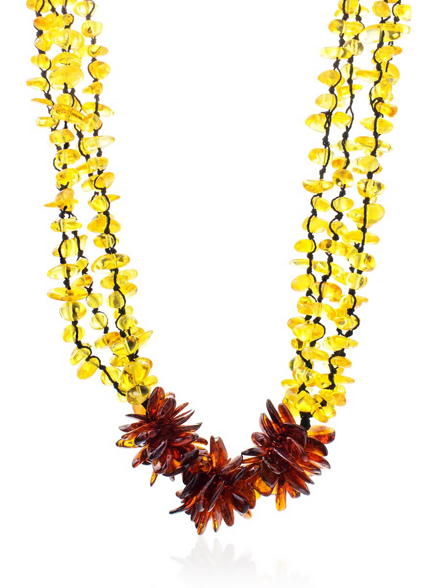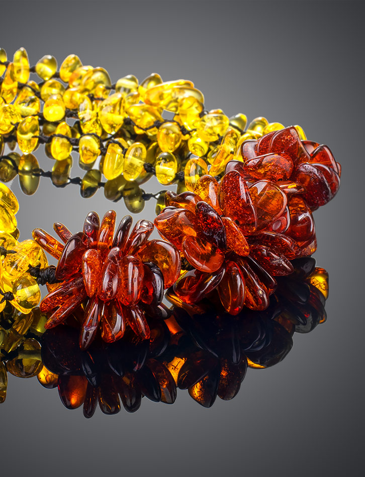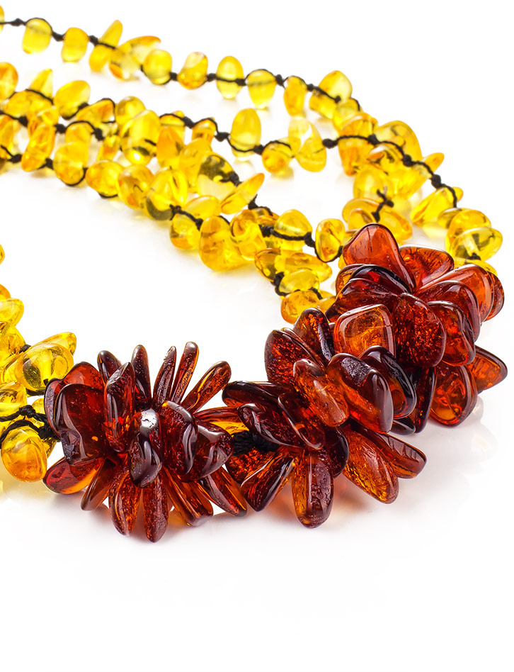 Плетёное колье «Хризантема» из натурального янтаря контрастных оттенков