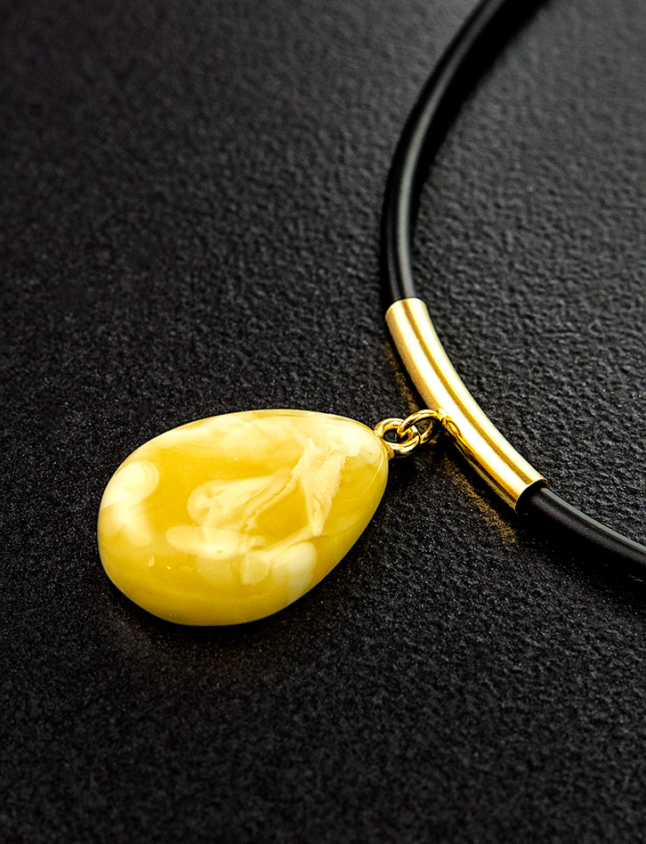 Кулон в форме капельки из натурального балтийского янтаря с красивой текстурой, оригинальным образом закреплённый на тонком каучуковом шнурке, добавит в ваш облик нотку готической романтики. Украшение подходит и для повседневных стилей, и для вечерних образов. _x000D_
