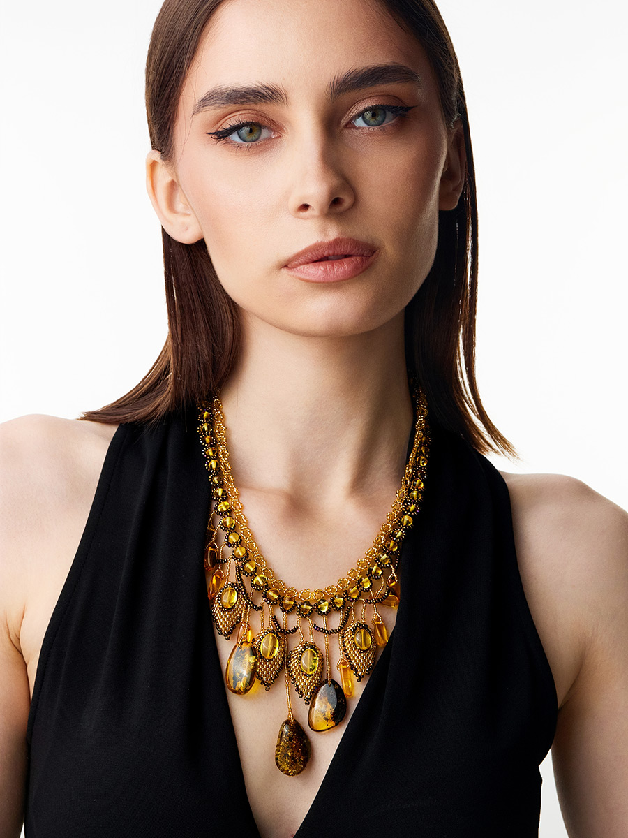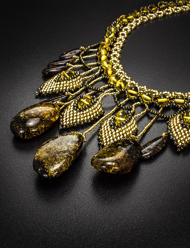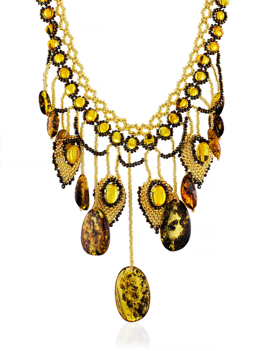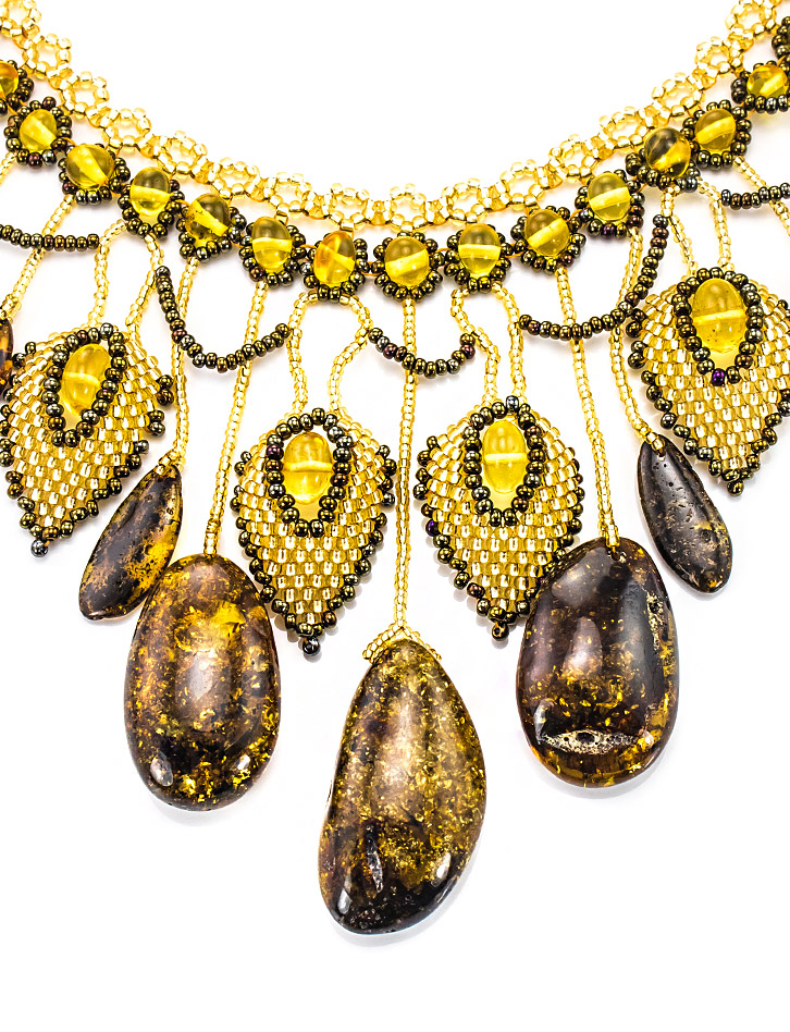 Потрясающее эффектное колье из бисера и искрящегося янтаря «Лукоморье»