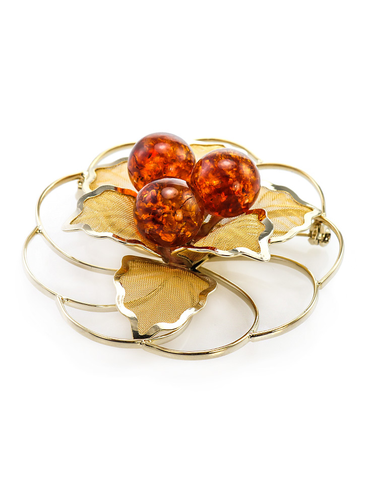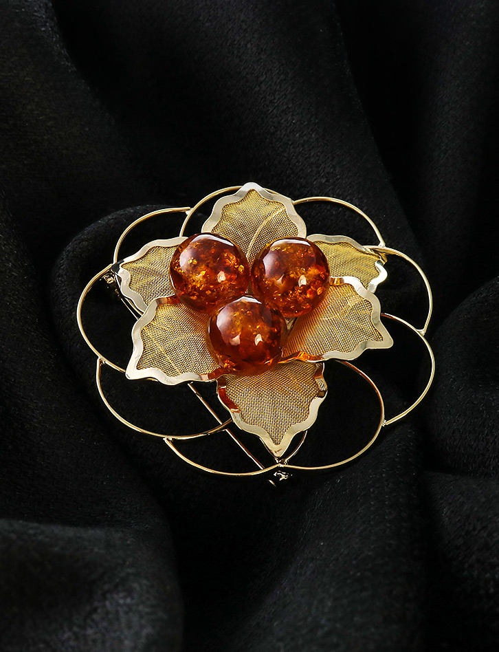 Позолоченная брошь круглой формы, украшенная натуральным коньячным янтарём Beoluna