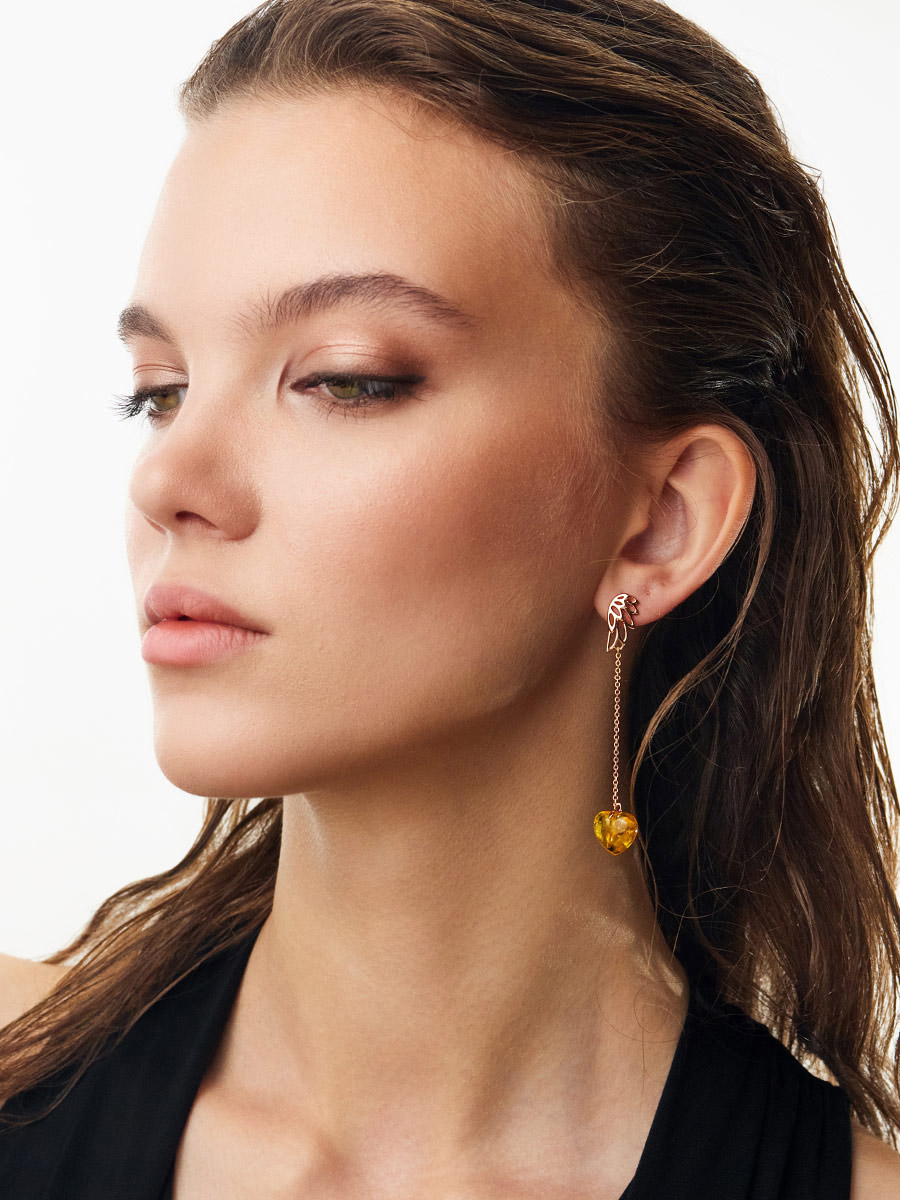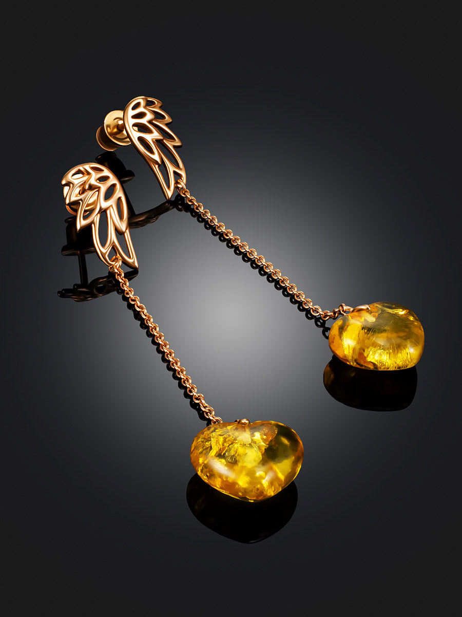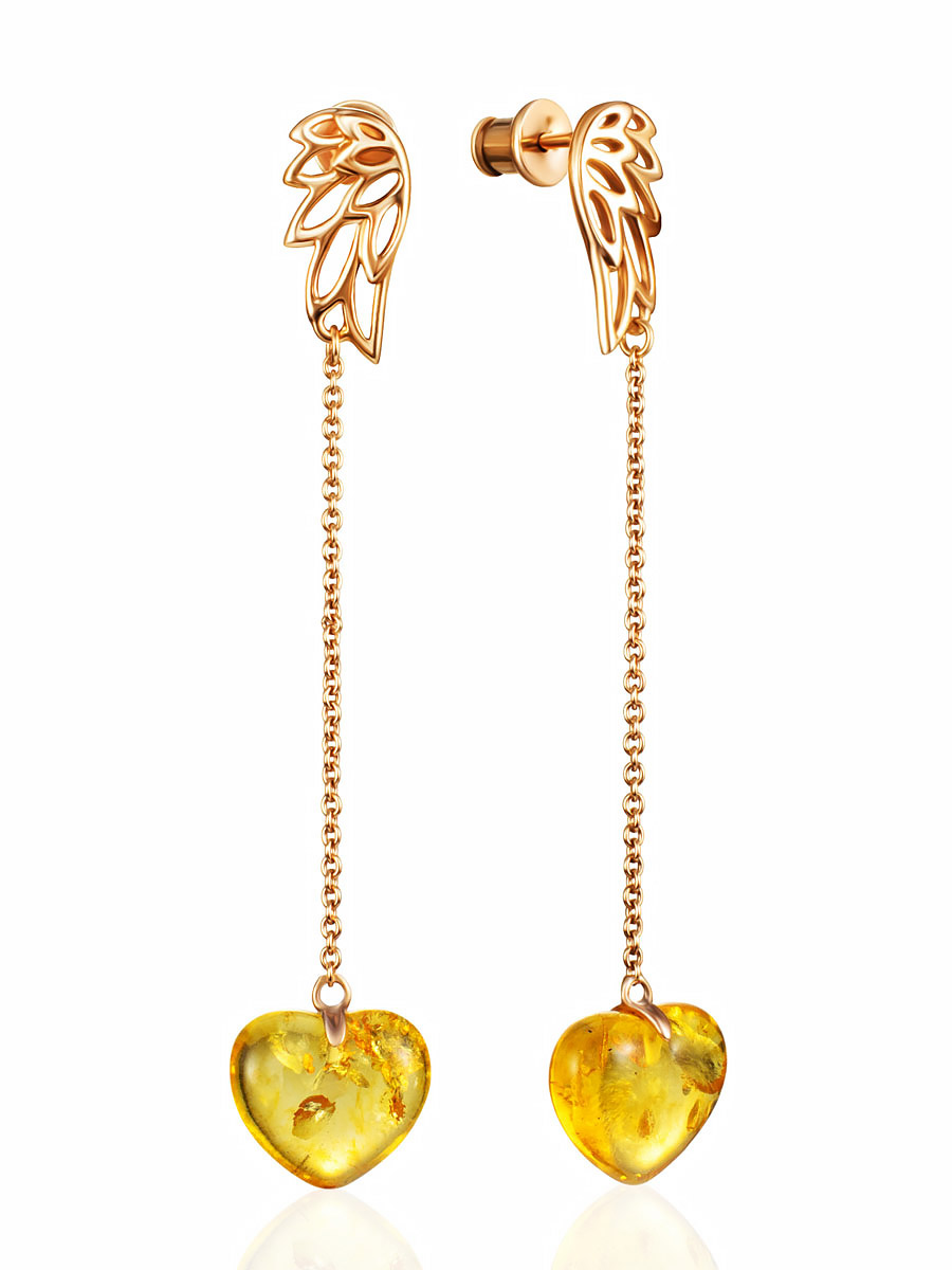 Позолоченные серьги-цепочки с крыльями и лимонным янтарём «Сердце»