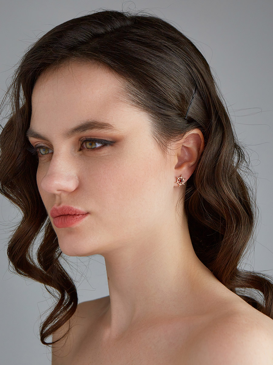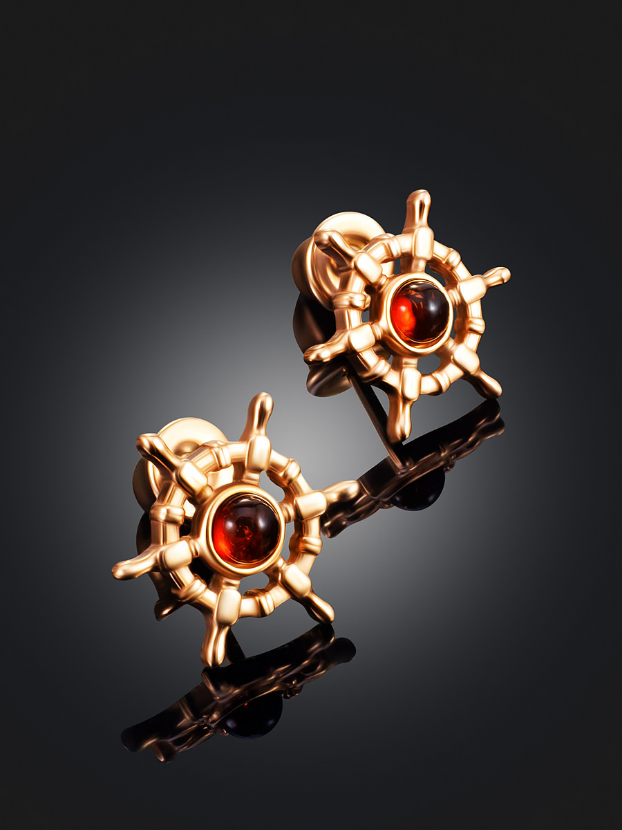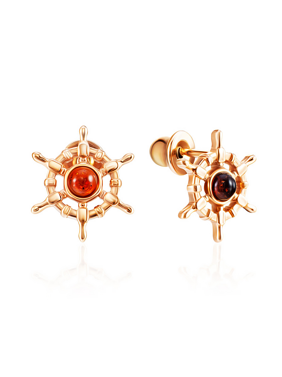 Позолоченные серьги-гвоздики «Штурвал» с натуральным коньячным янтарём