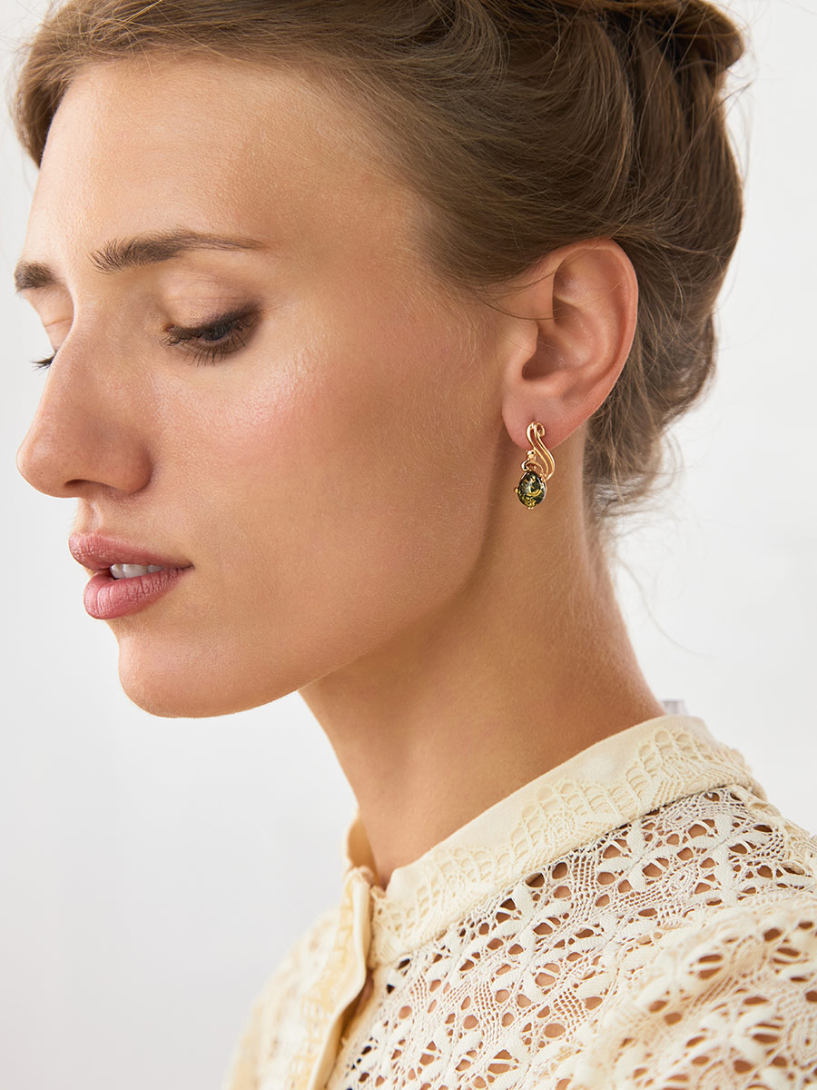 Позолоченные серьги «Медея» с натуральным зелёным янтарём