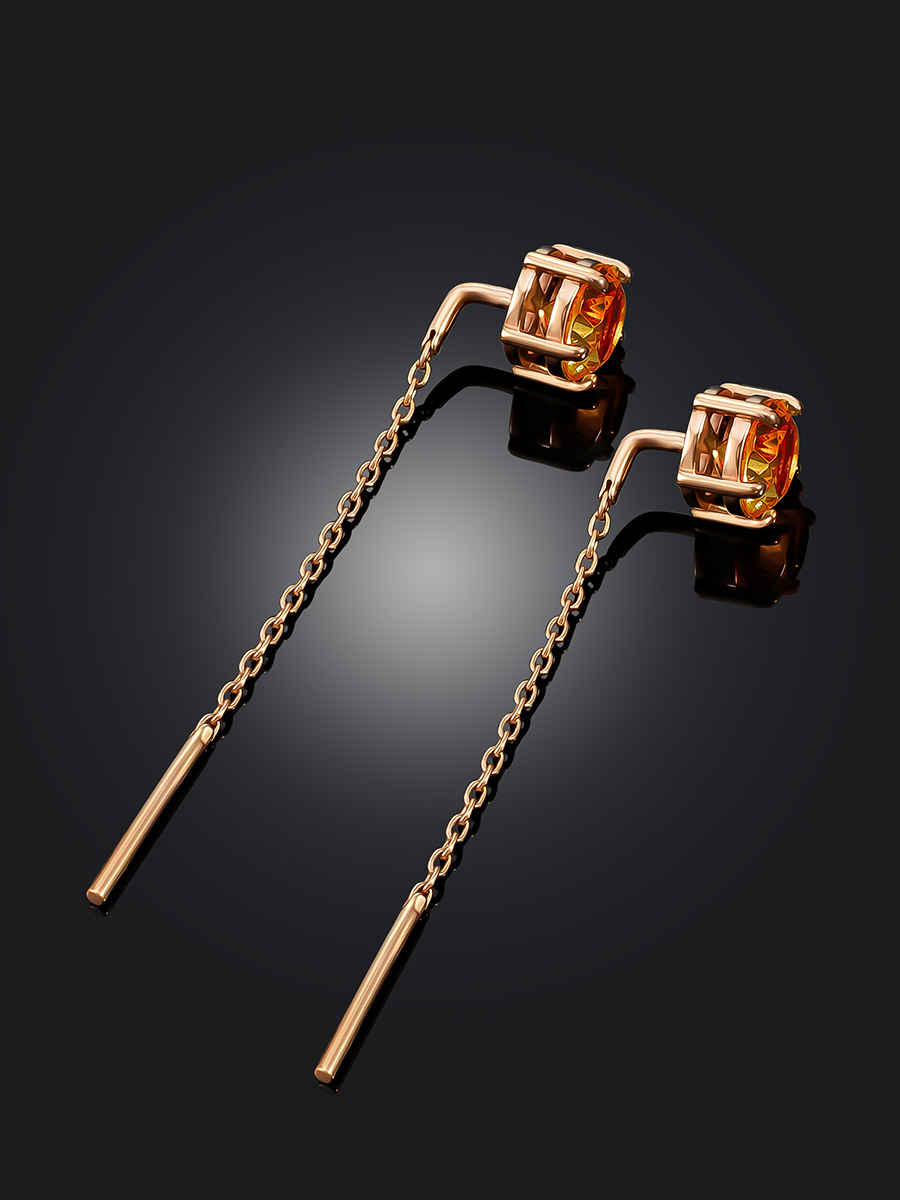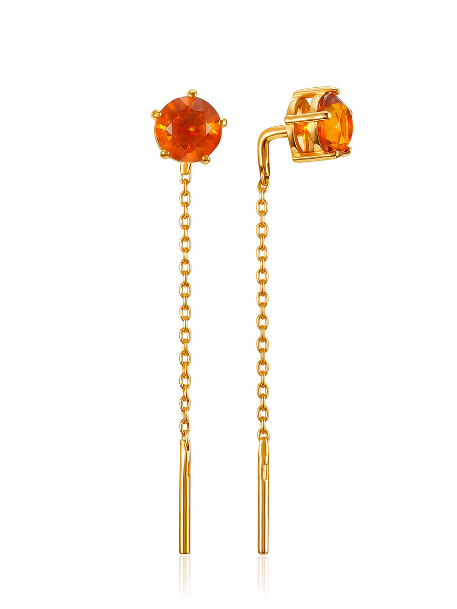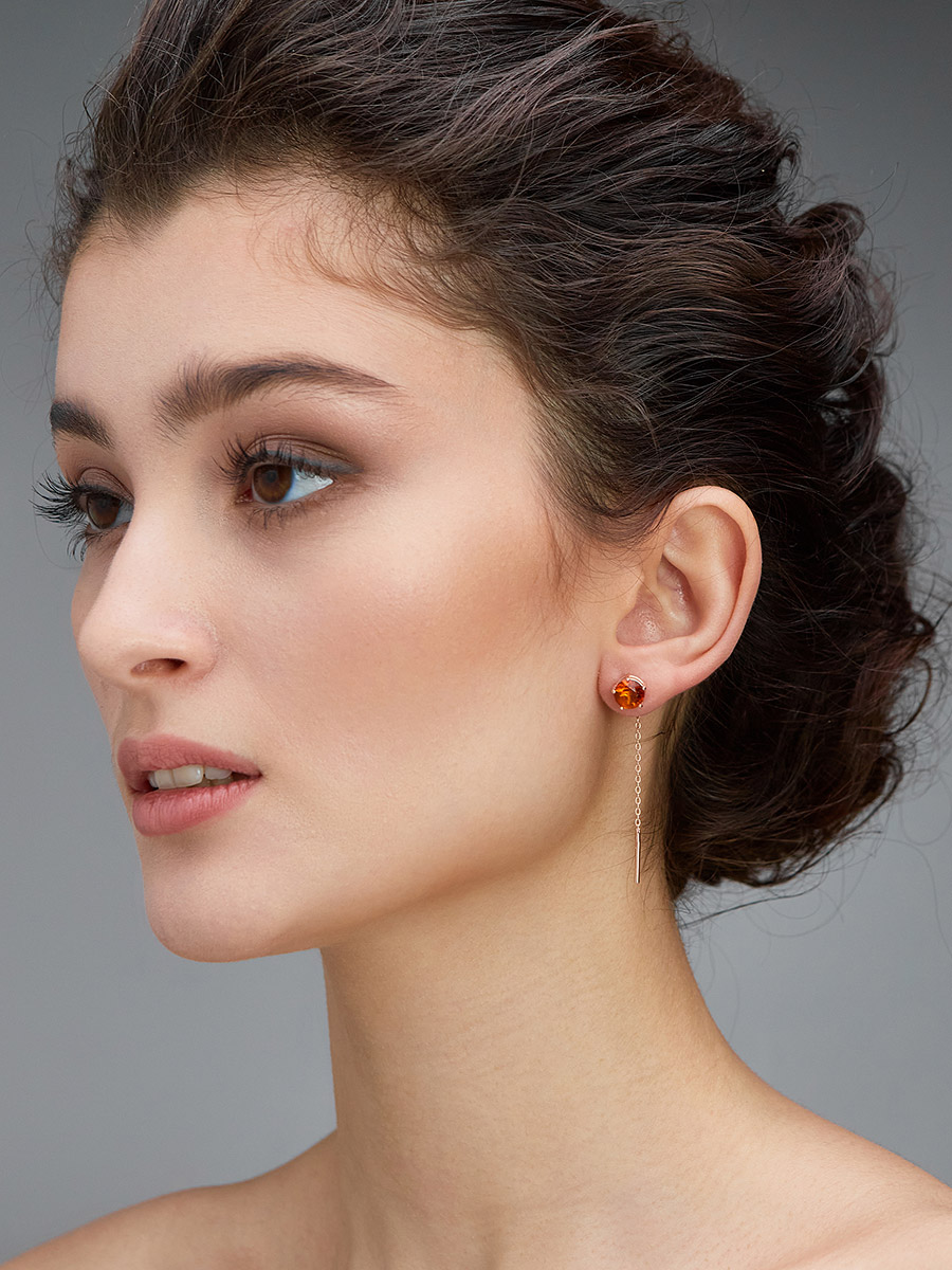 Позолоченные серьги-продёвки с гранёным янтарём коньячного цвета «Баккара»