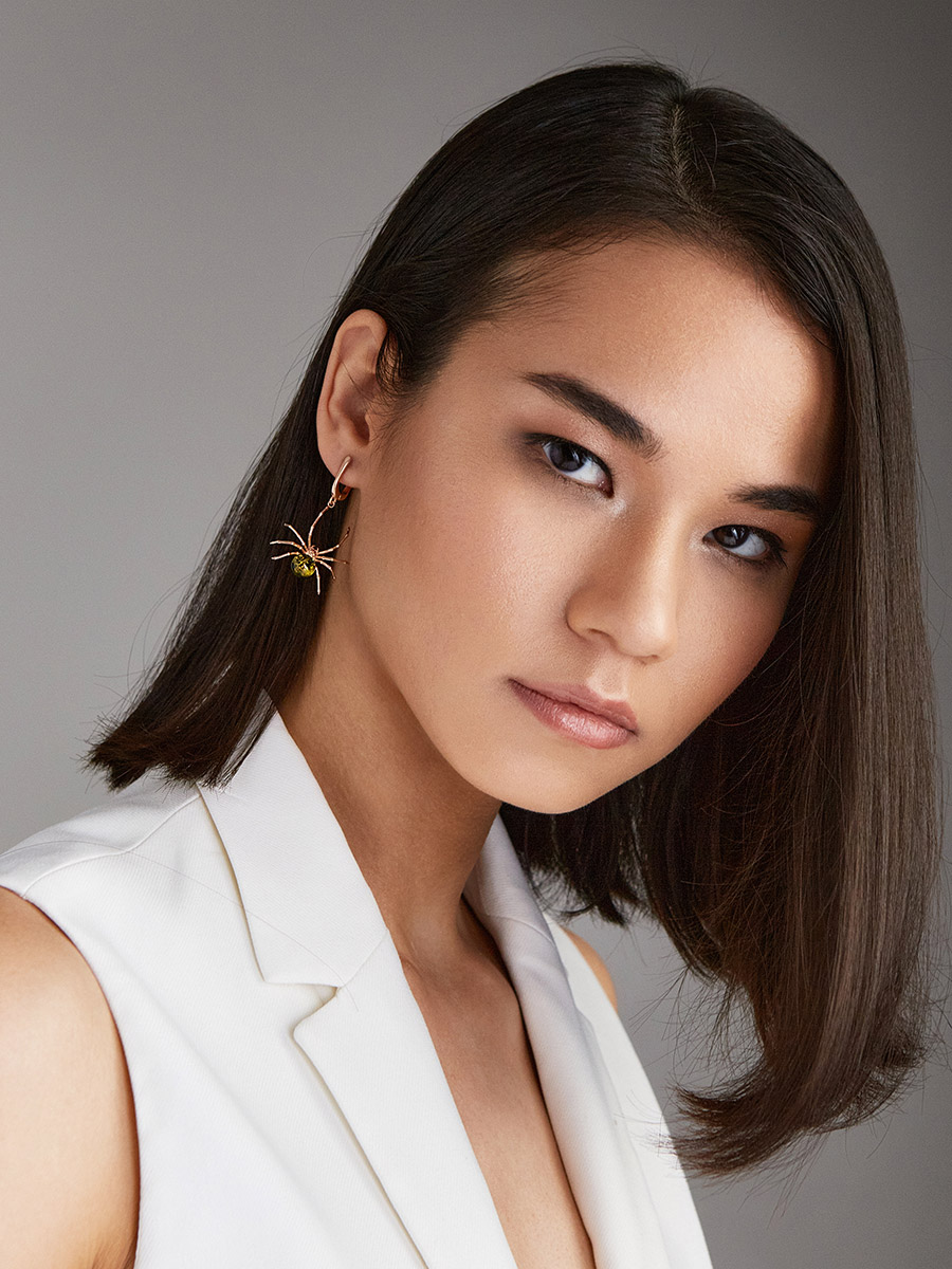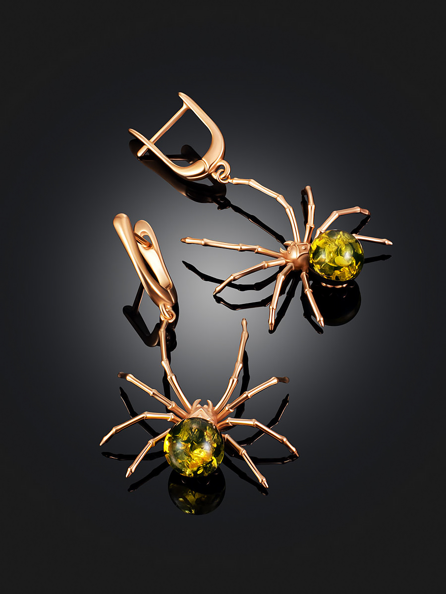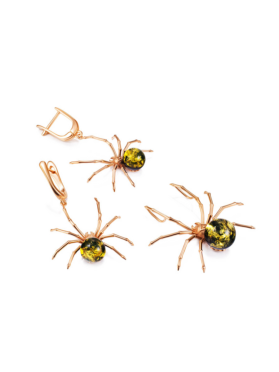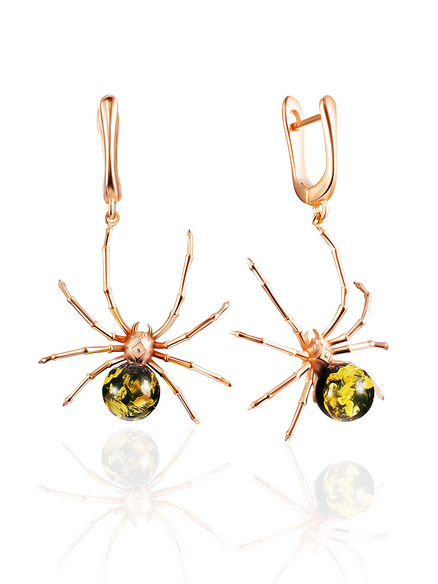 Позолоченные серьги с янтарём зелёного цвета «Паучок»