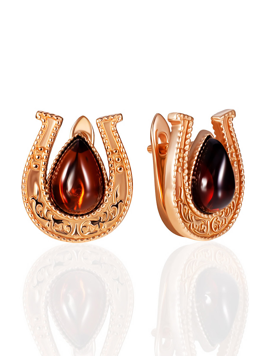 Позолоченные серьги-талисман «Подкова» с натуральным янтарём