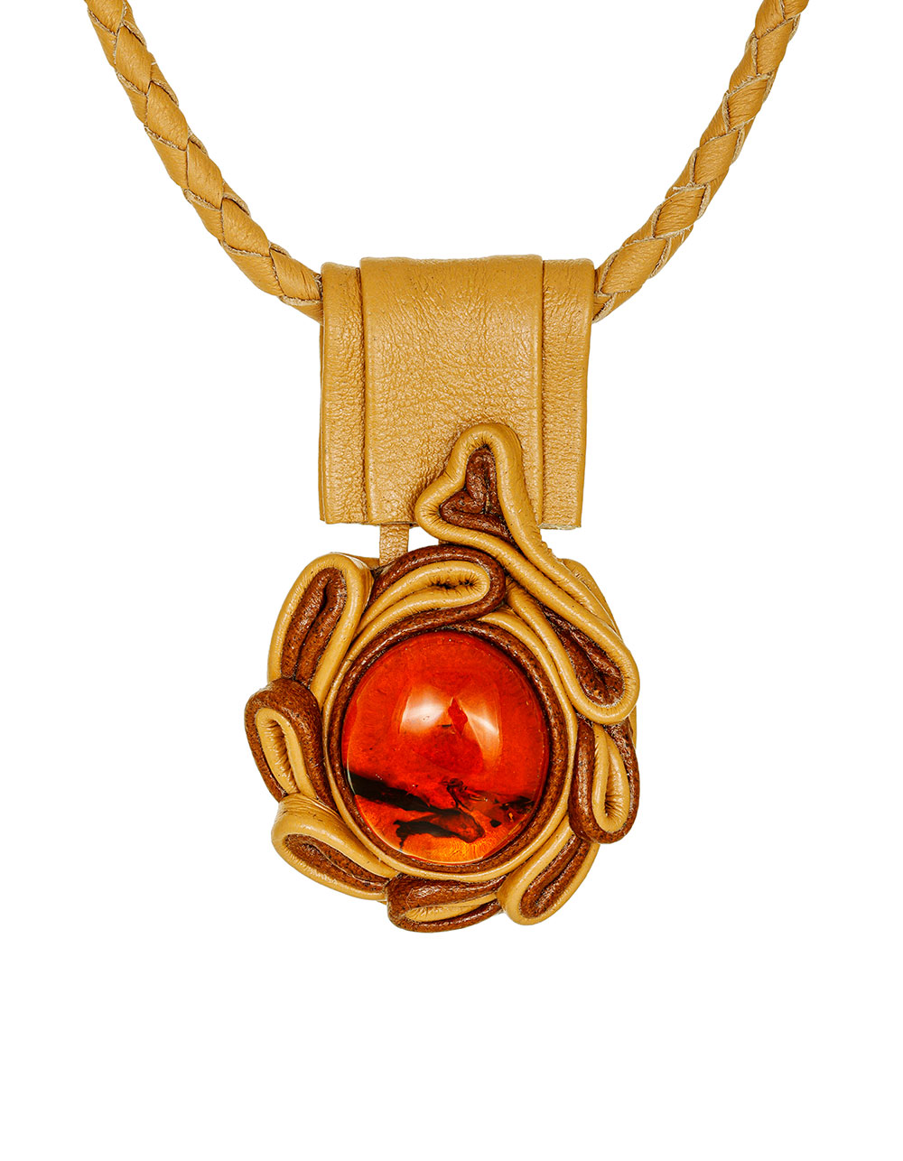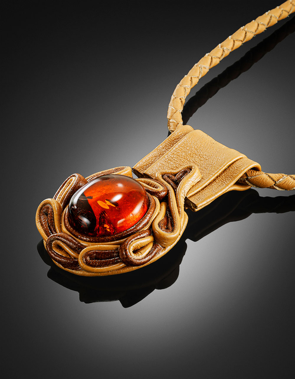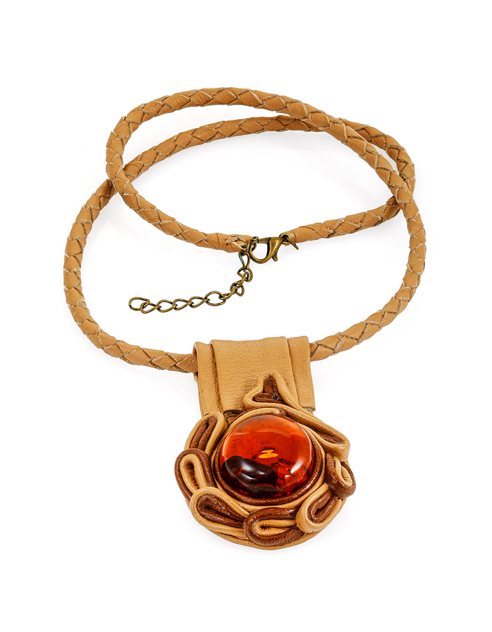 Привлекательное колье из натуральной кожи и янтаря «Амазонка»