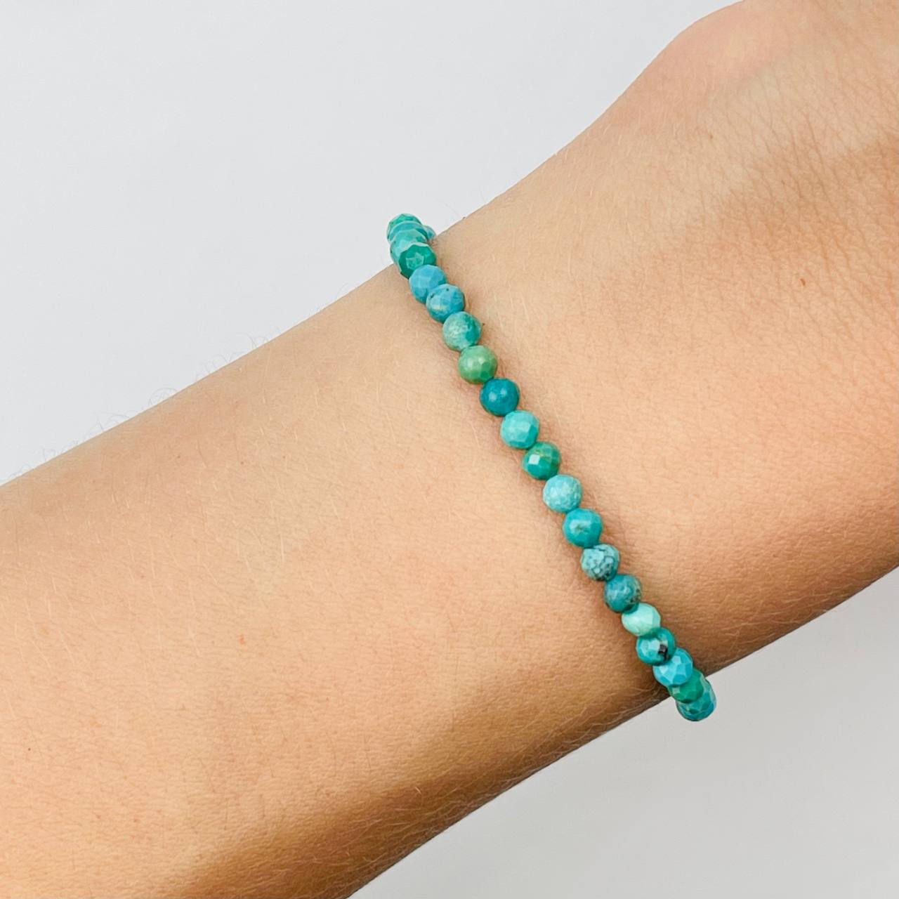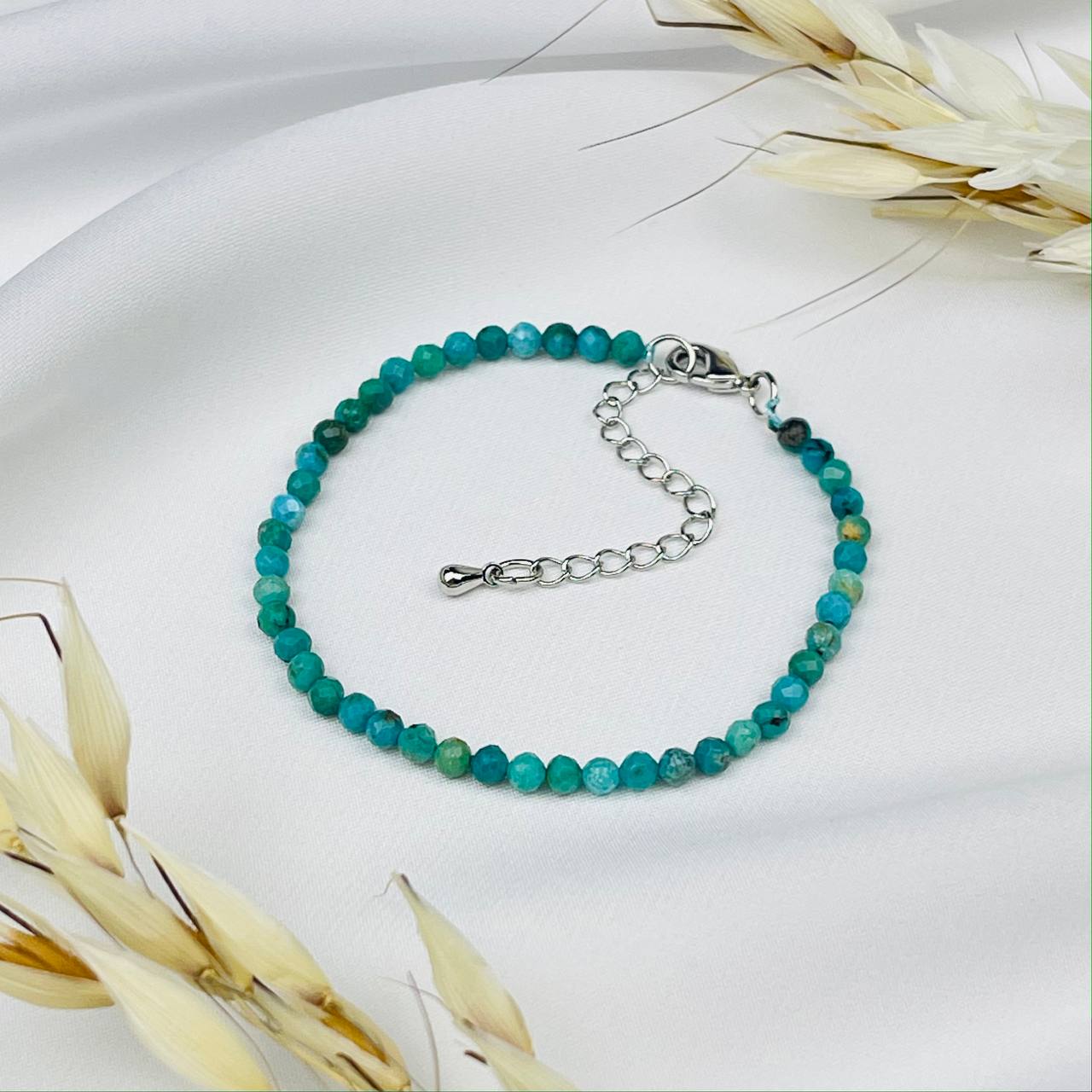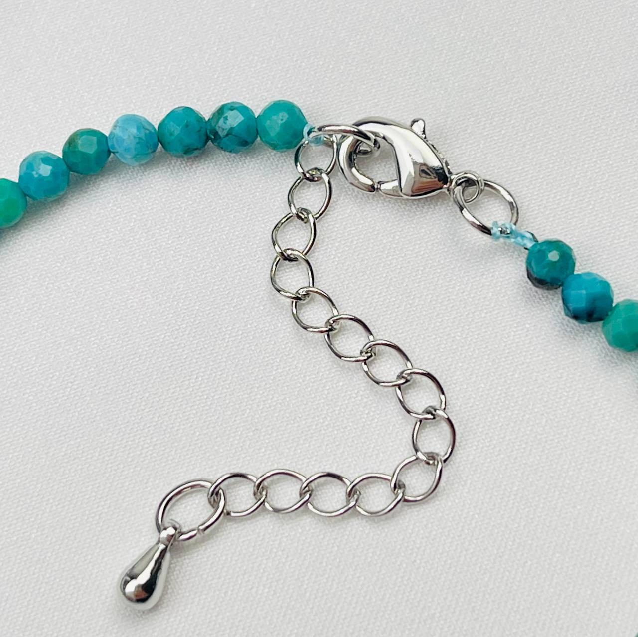 Цвет камня: Бирюзовый Месторожден..показатьие: Хубэй Камень: Бирюза Покрытие: Бижутерный сплав Диаметр: 3,5 мм Вязка: без узелка Поверхность: Граненый Производитель: Радуга Самоцветов (Россия) Тип замка: Карабиние: Хубэй
