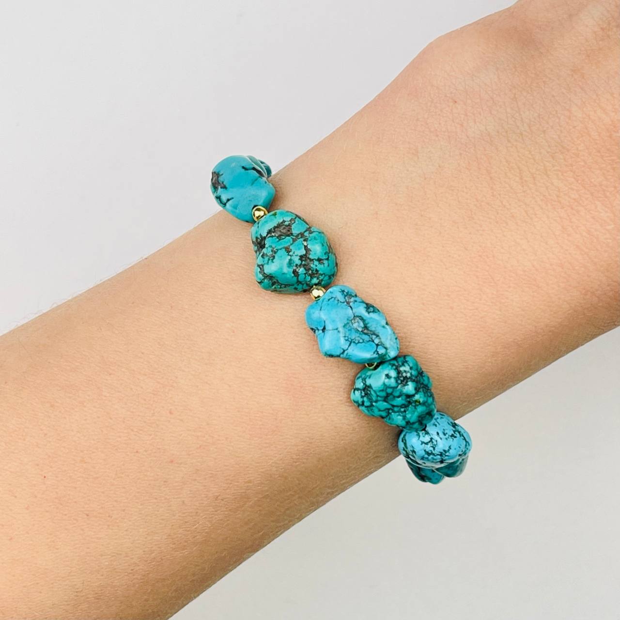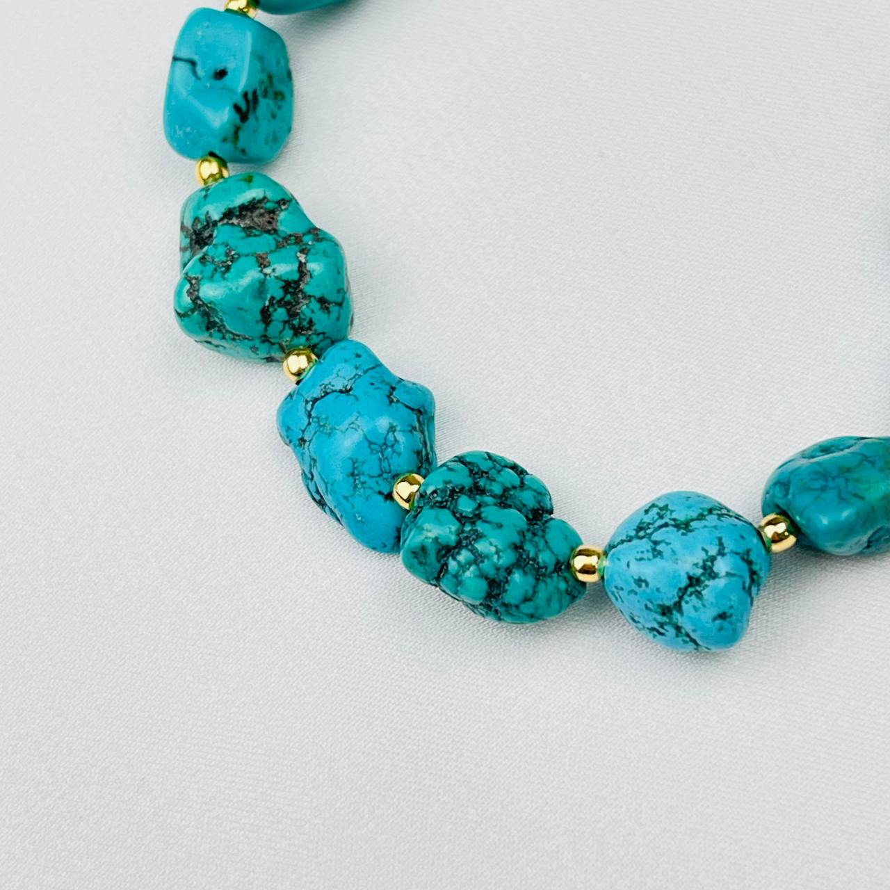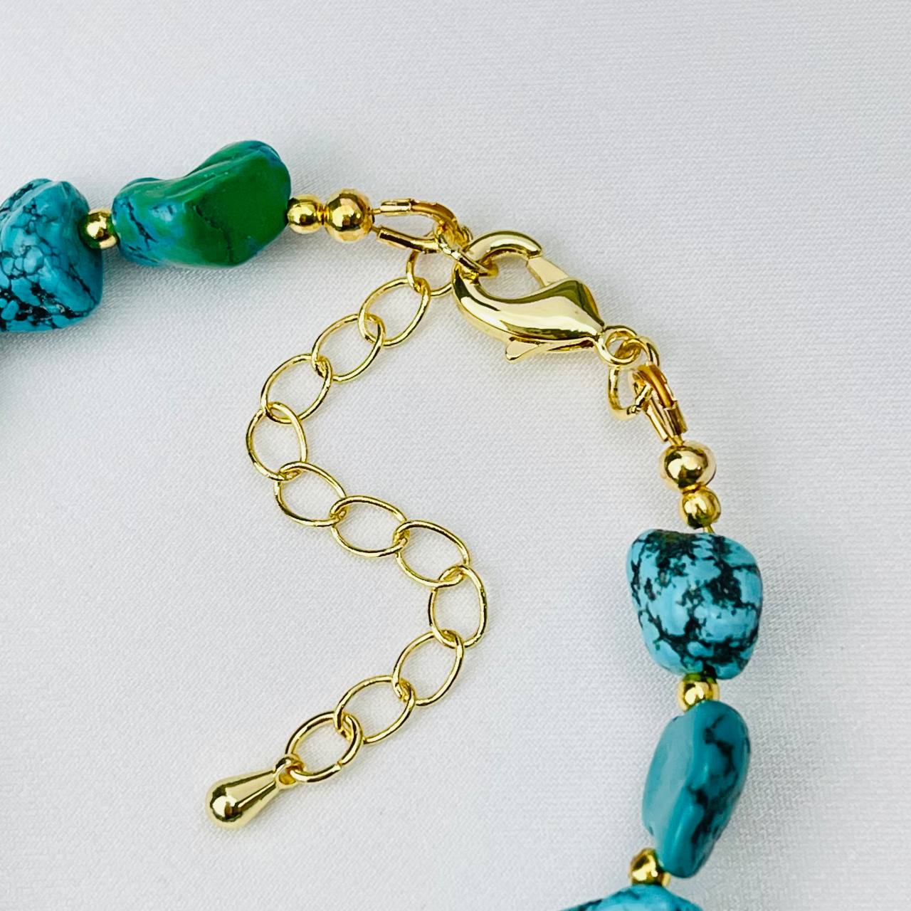 Цвет камня: Бирюзовый Месторожден..показатьие: Хубэй Камень: Бирюза Покрытие: Золото 14К Диаметр: 8-11 мм Поверхность: Необработанный Производитель: Радуга Самоцветов (Россия) Тип замка: Карабин с цепочкойие: Хубэй