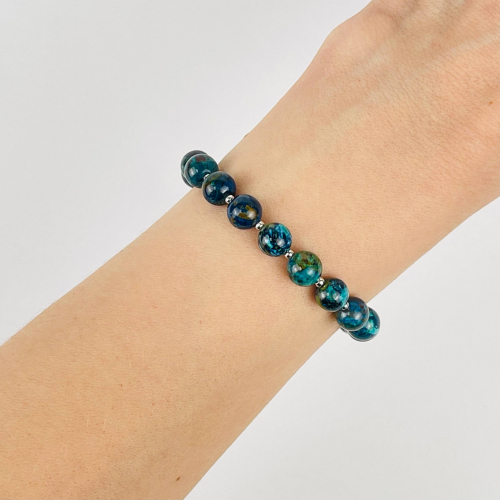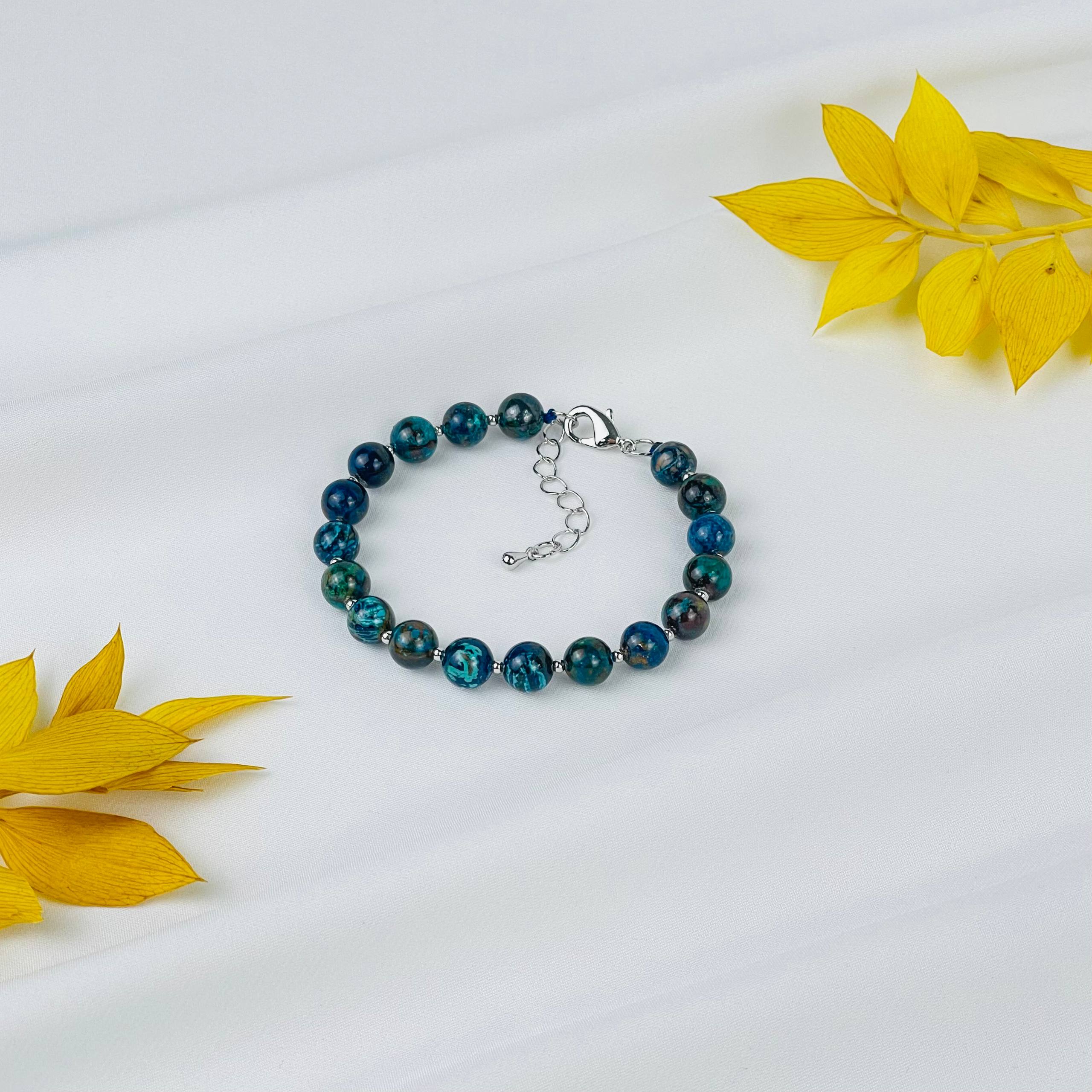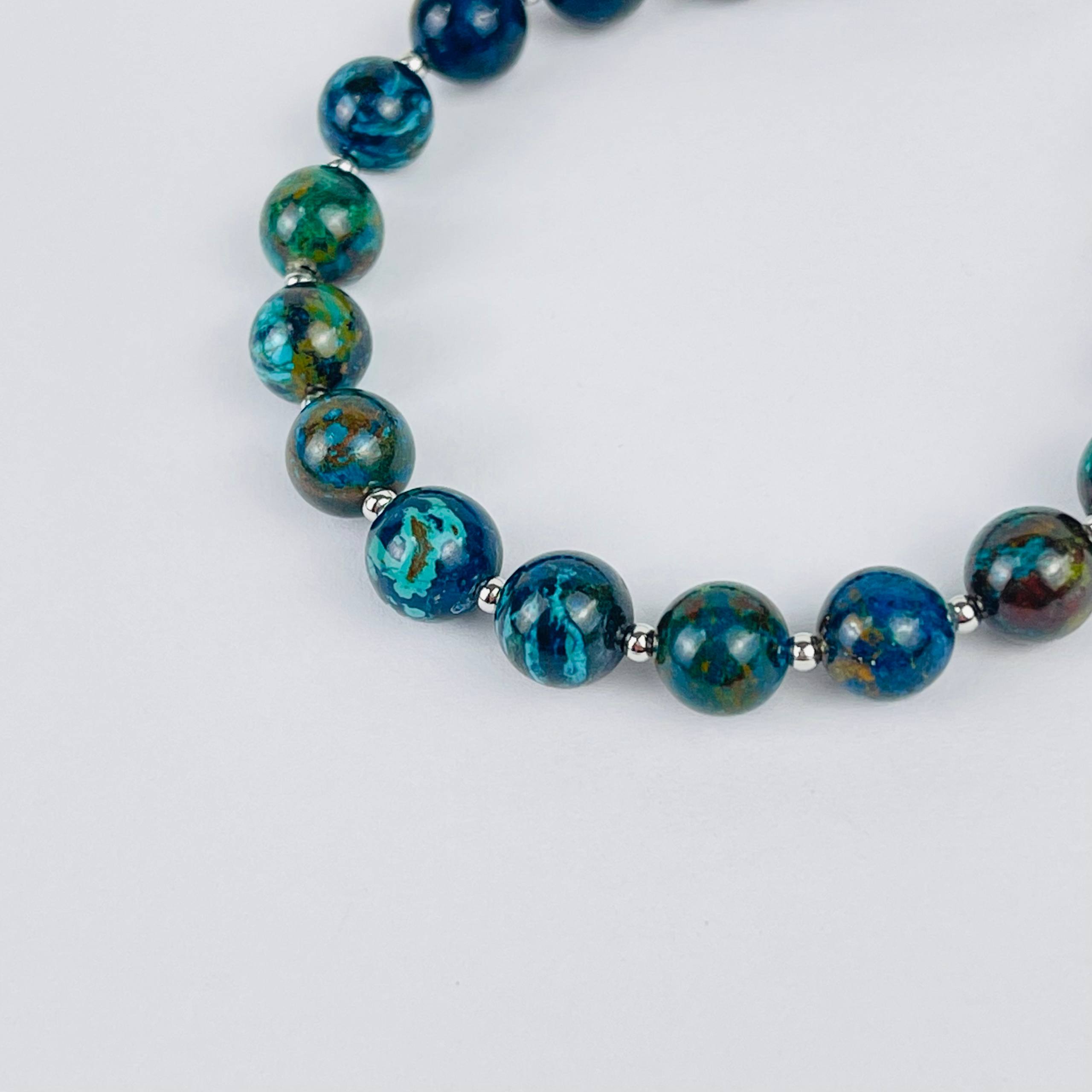 Цвет камня: Миксовый Месторождени..показатье: США Камень: Хризоколла Покрытие: Бижутерный сплав Диаметр: 7 мм Поверхность: Гладкий Производитель: Радуга Самоцветов (Россия) Тип замка: Карабин с цепочкойе: США