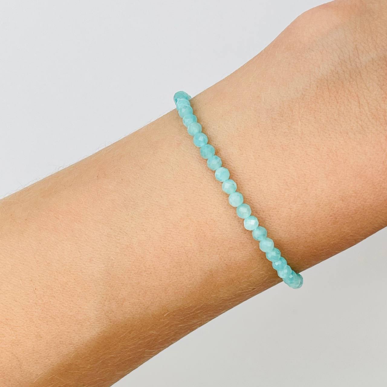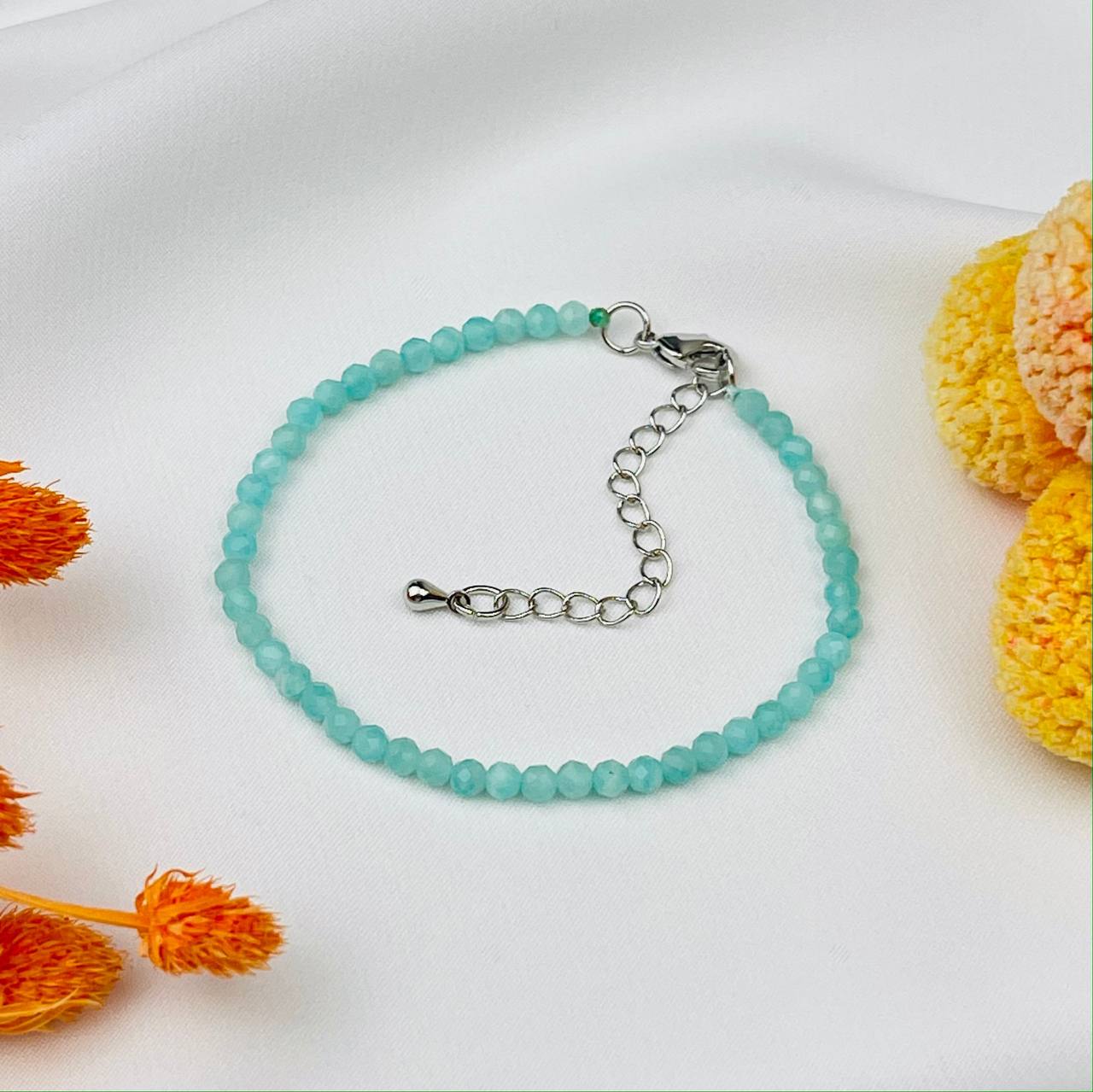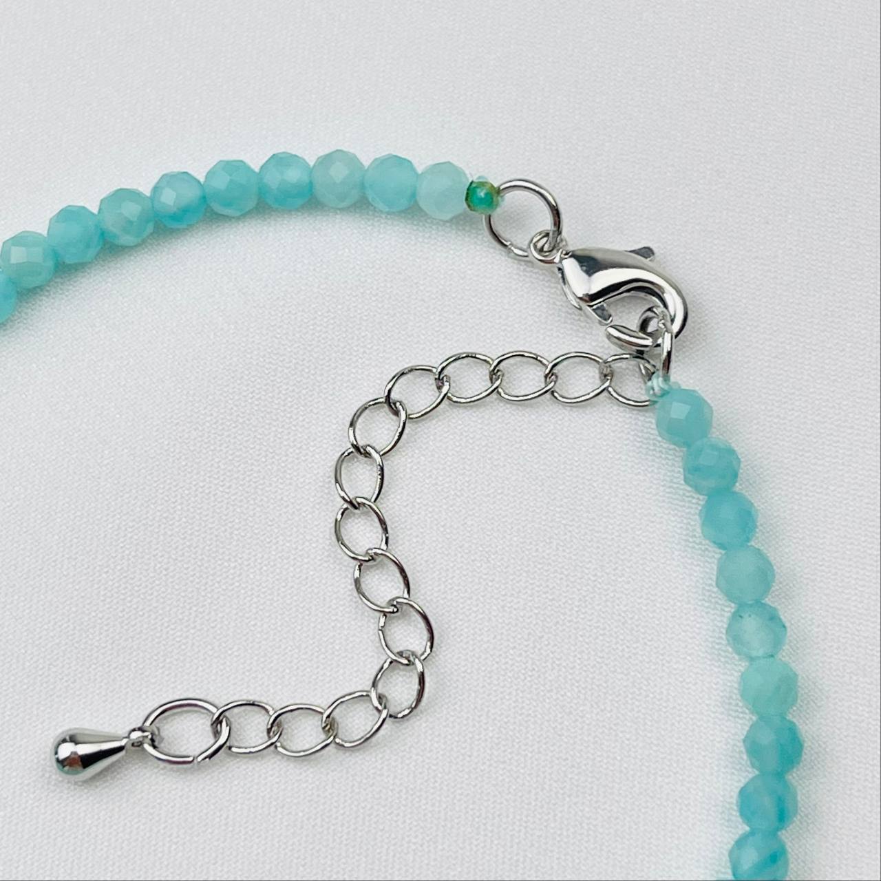 Цвет камня: Бирюзовый Месторожден..показатьие: Перу Камень: Амазонит Покрытие: Бижутерный сплав Диаметр: 3 мм Поверхность: Граненый Производитель: Радуга Самоцветов (Россия) Тип замка: Карабин с цепочкойие: Перу