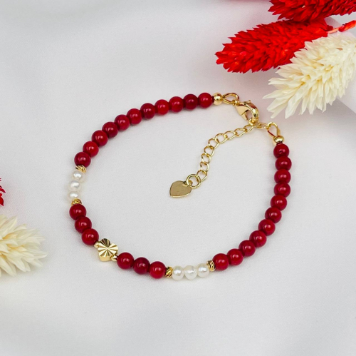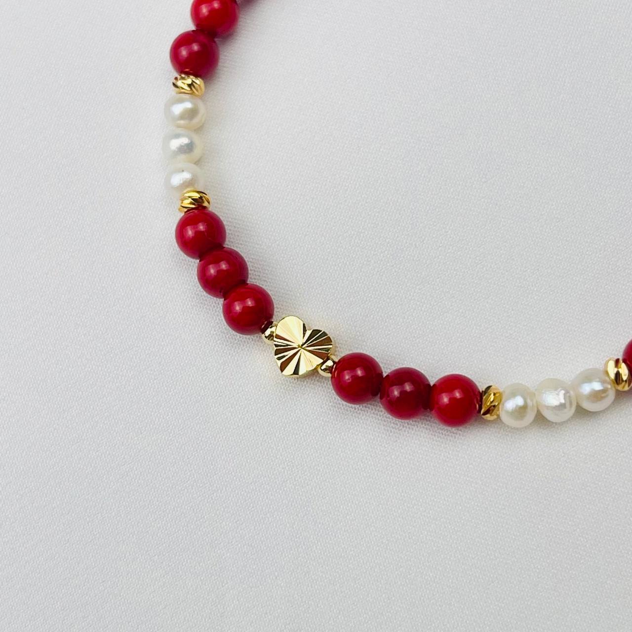 Радуга Самоцветов Браслет из Коралла и Жемчуга со вставкой "Сердце"
