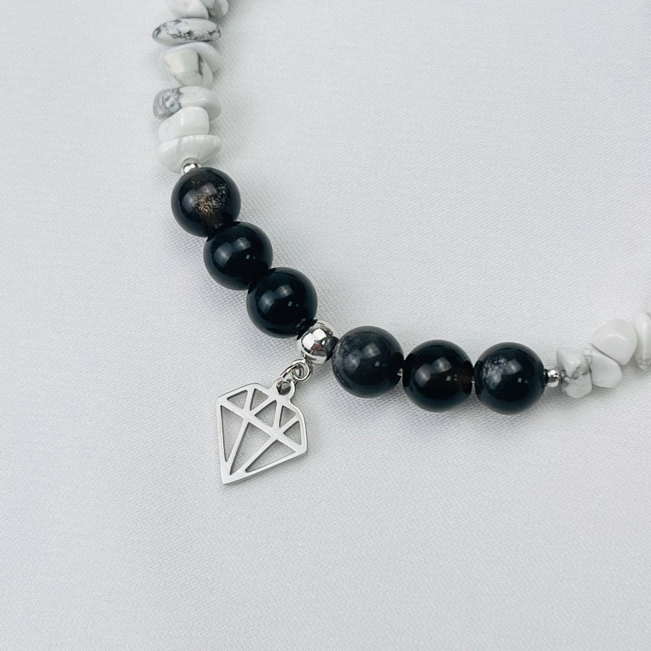 Радуга Самоцветов Браслет из серебристого Обсидиана и Говлита с подвеской