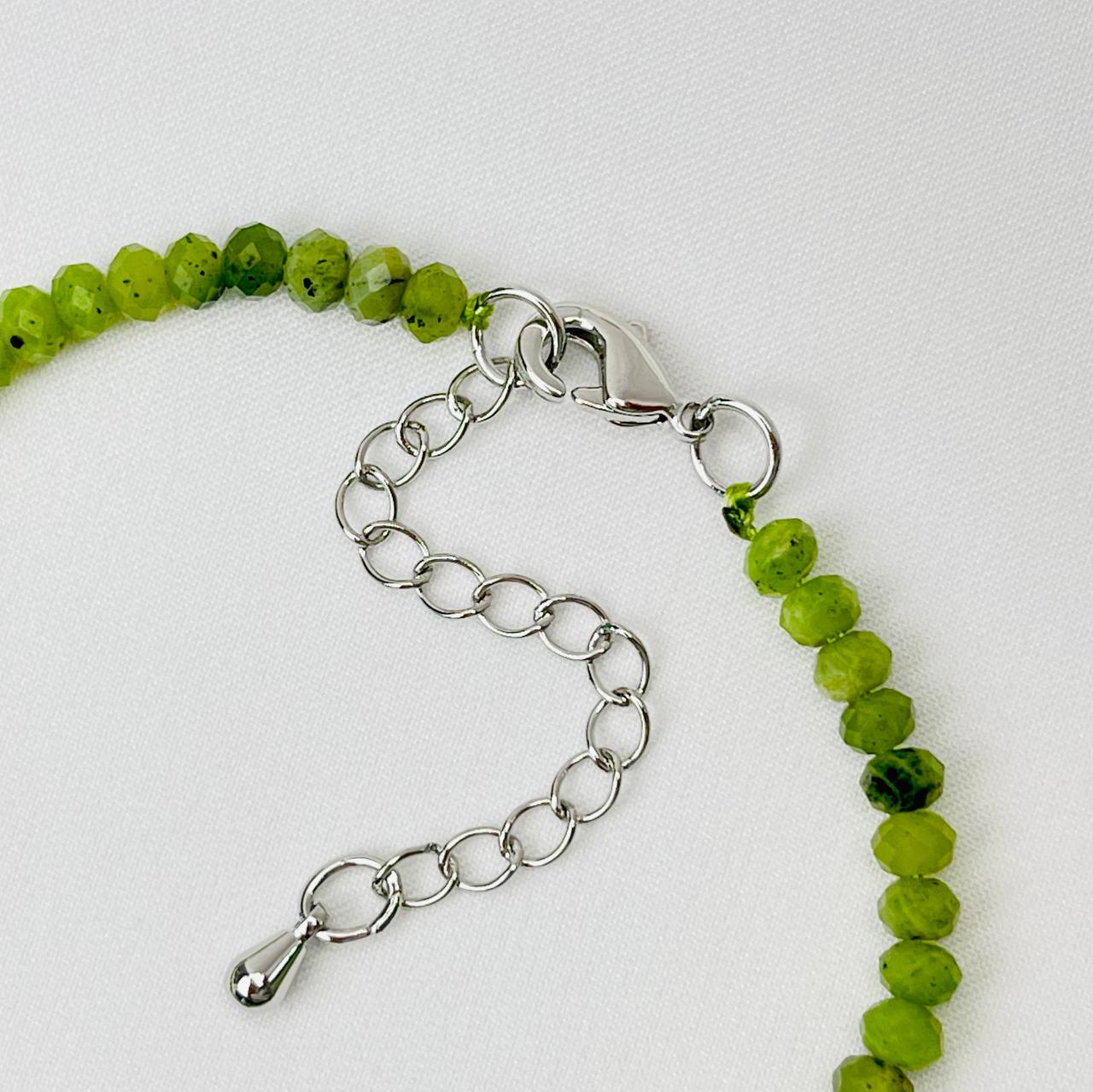Цвет камня: Зелёный Месторождение..показать: Канада Камень: Змеевик Покрытие: Бижутерный сплав Поверхность: Граненый Размер: 3х4 мм Производитель: Радуга Самоцветов (Россия) Тип замка: Карабин с цепочкой: Канада