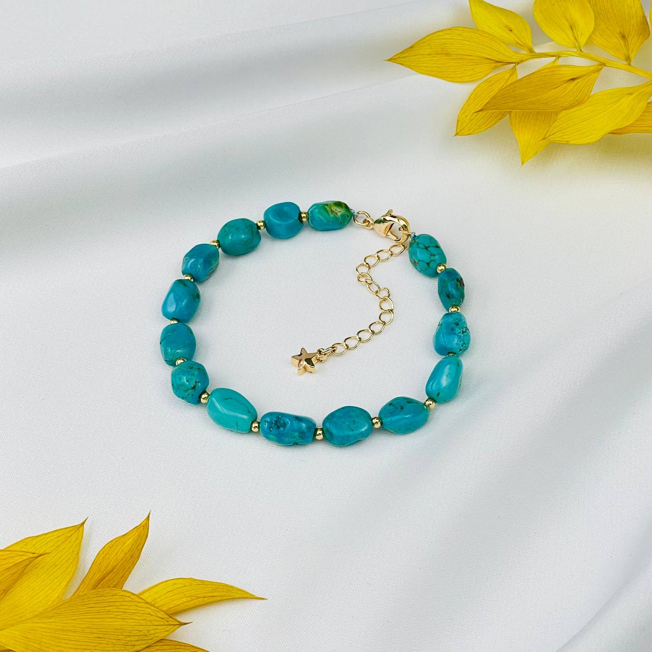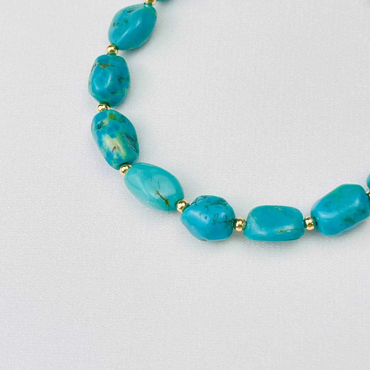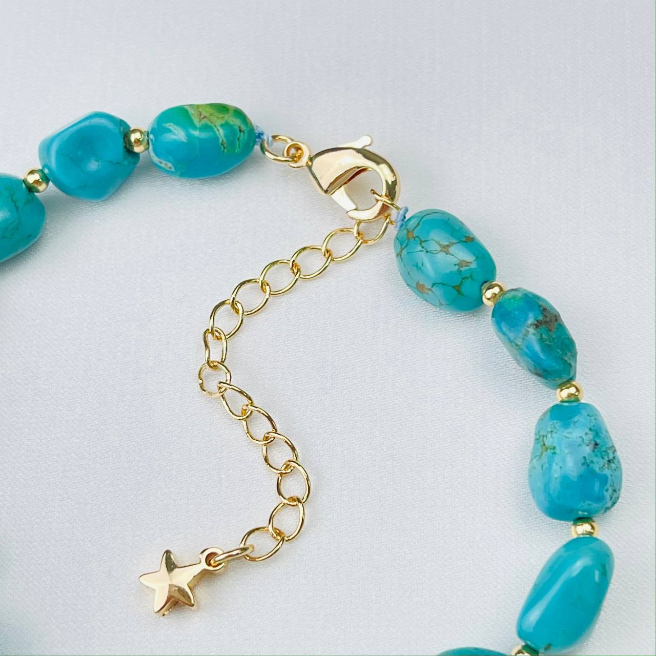 Цвет камня: Бирюзовый Месторожден..показатьие: Хубэй Камень: Бирюза Покрытие: Золото 14К Диаметр: 7-8 мм Поверхность: Необработанный Производитель: Радуга Самоцветов (Россия) Тип замка: Карабин с цепочкойие: Хубэй