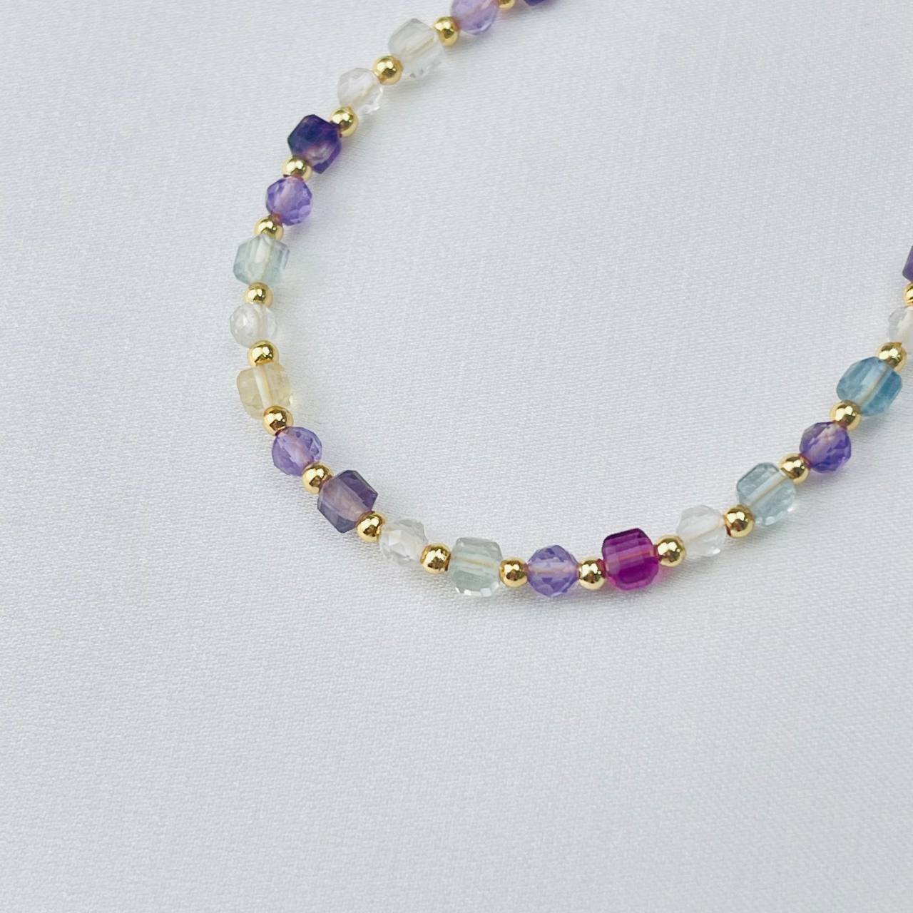 Цвет камня: Миксовый Месторождени..показатье: Бразилия Камень: Аметист Вставка: Флюорит Покрытие: Золото 14К Диаметр: 3 мм Поверхность: Граненый Размер: 3х3 мм Производитель: Радуга Самоцветов (Россия) Тип замка: Карабин с цепочкойе: Бразилия
