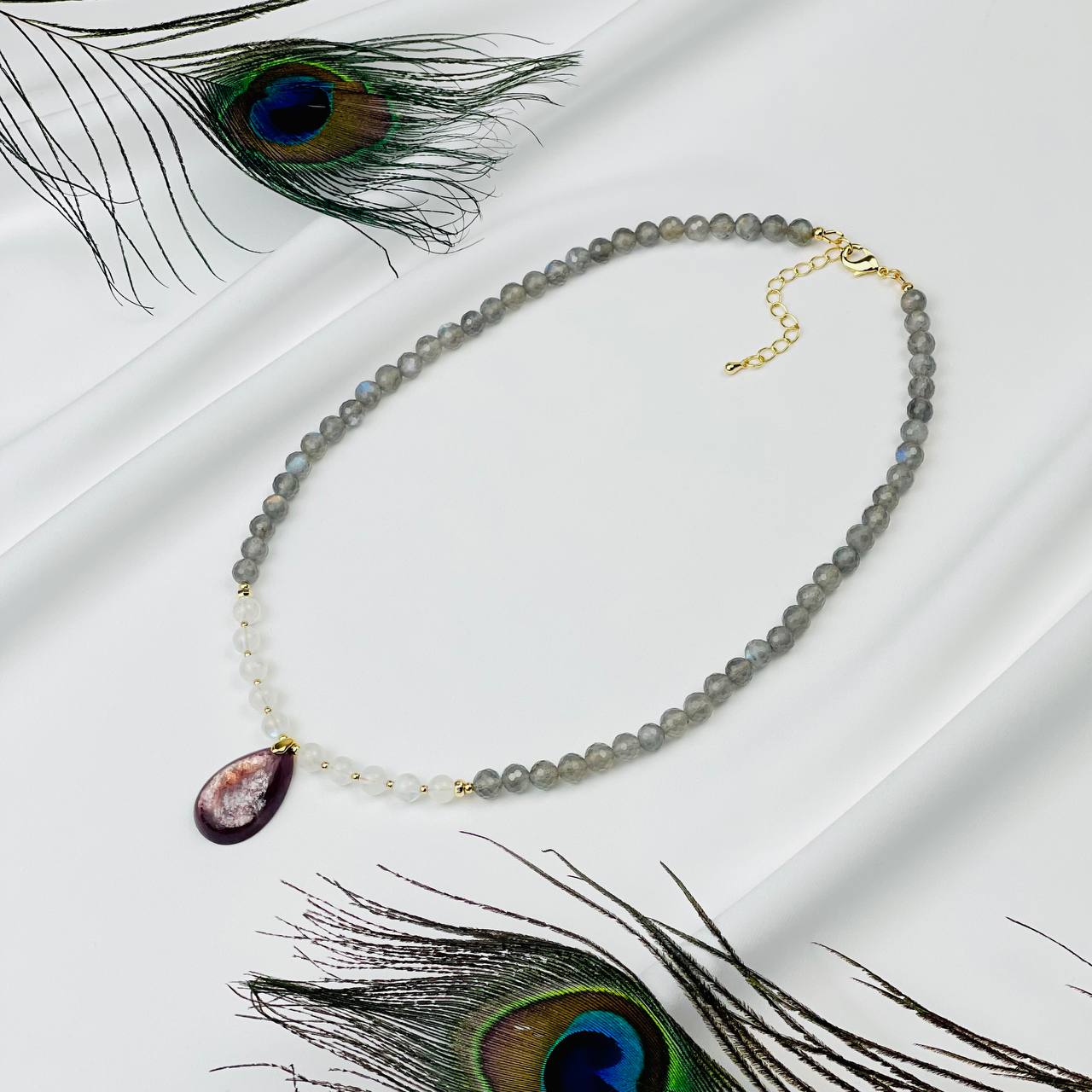 Радуга Самоцветов Колье из Лабрадора и Лунного камня с кулоном из Лепидолита