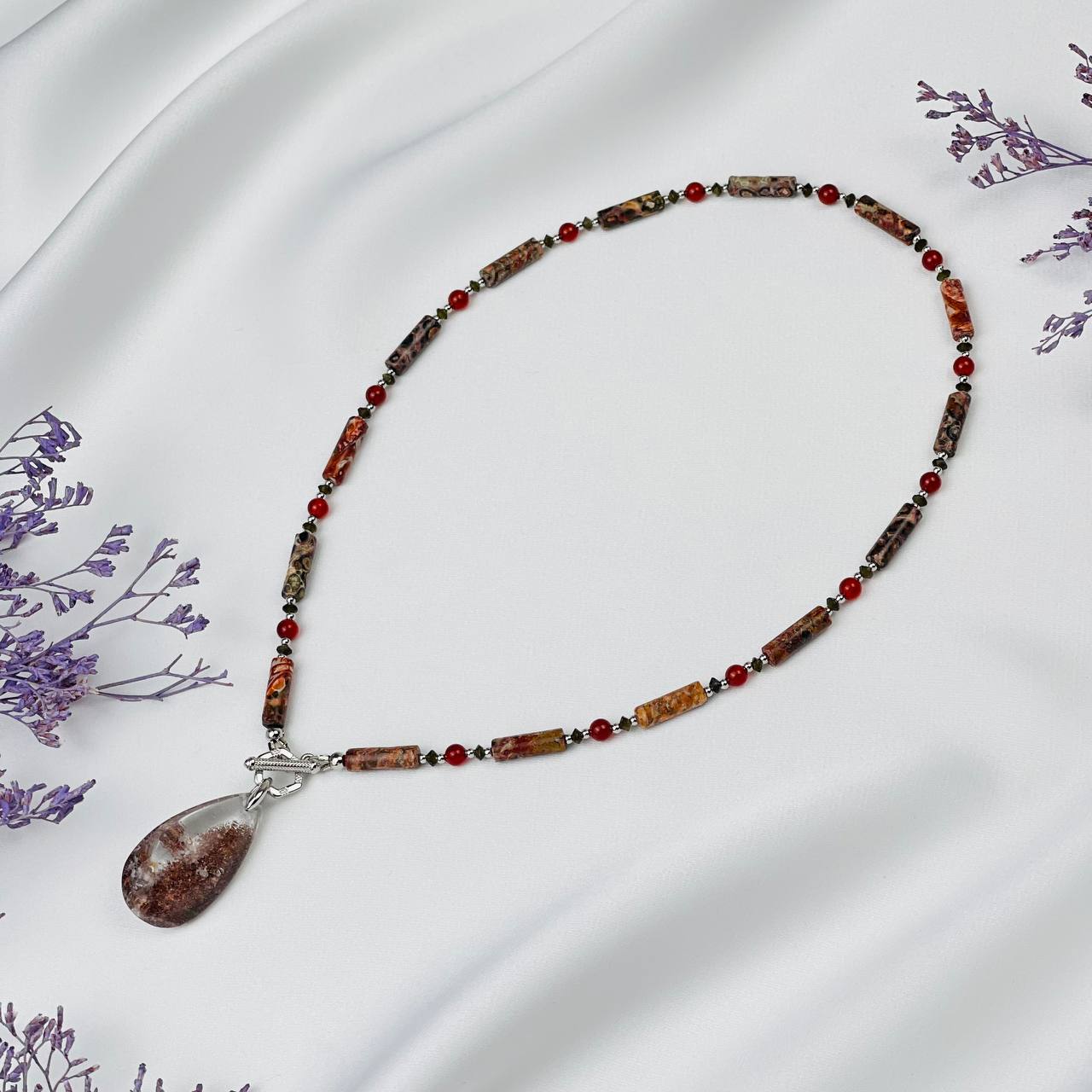 Радуга Самоцветов Колье из леопардовой Яшмы,Сердолика и Обсидиана с кулоном из Лодолита