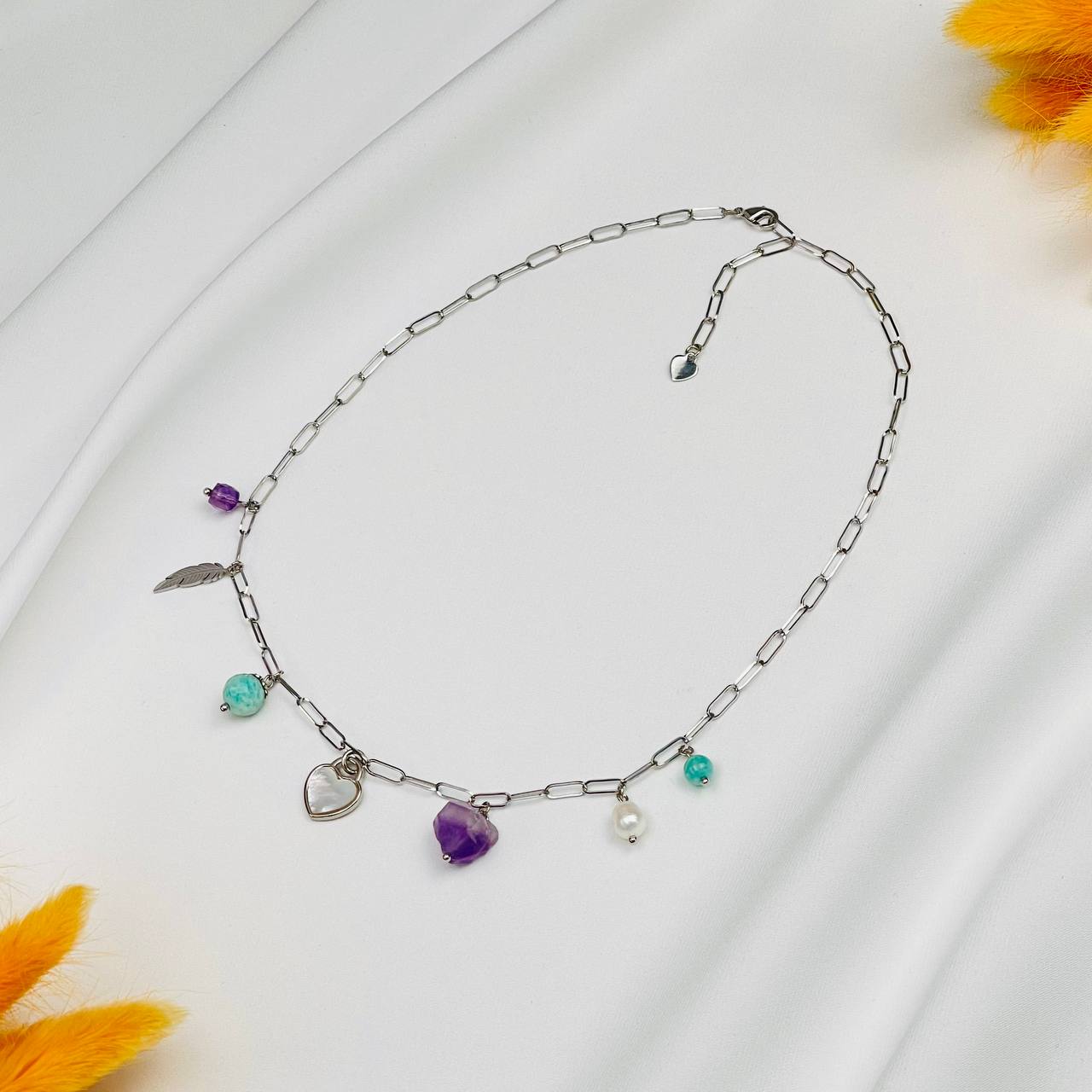 Радуга Самоцветов Колье на цепочке с Амазонитом, Аметистом, Жемчугом и Перламутром