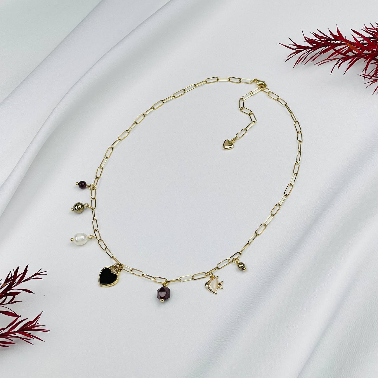 Радуга Самоцветов Колье на цепочке с Гранатом, Пиритом, Жемчугом и Перламутром