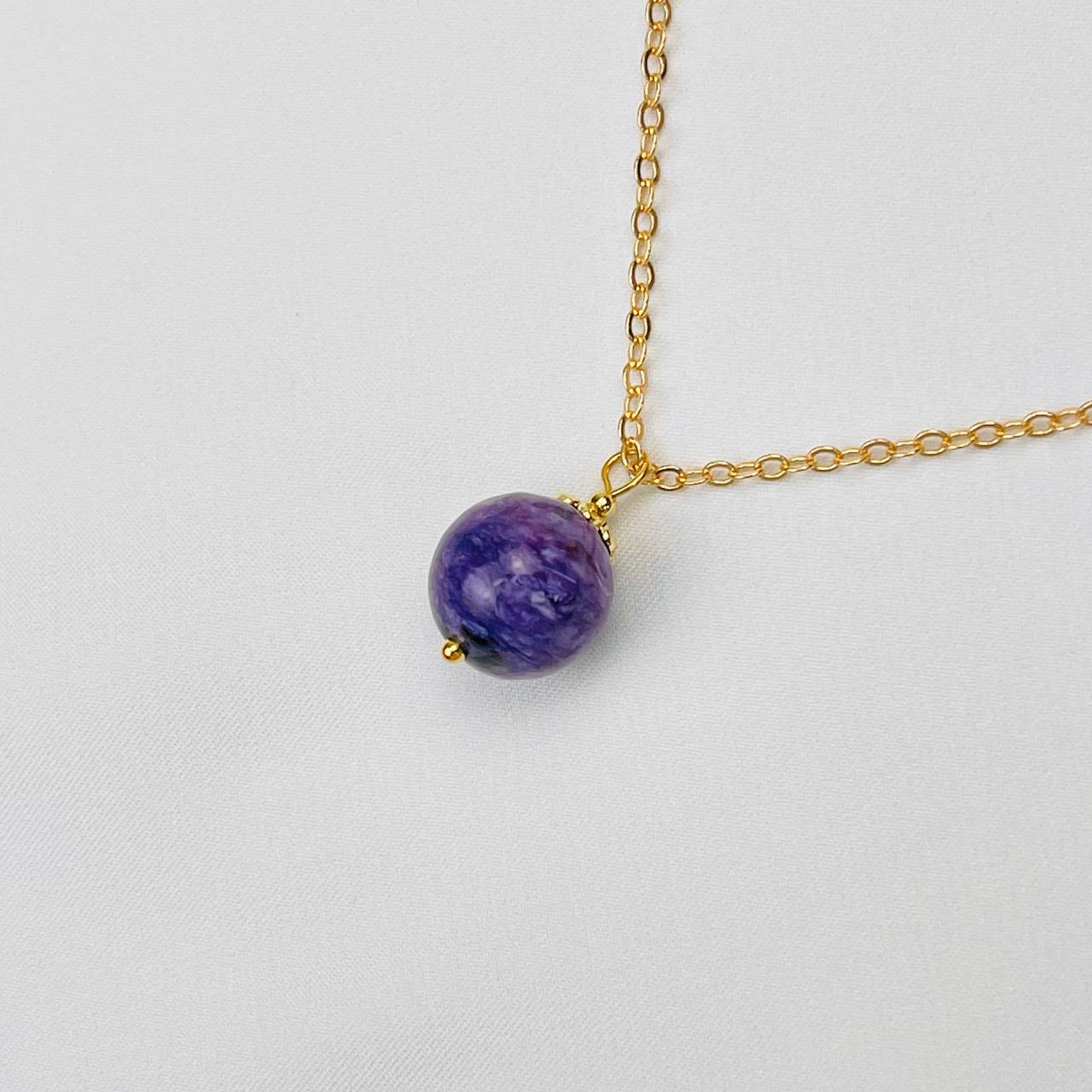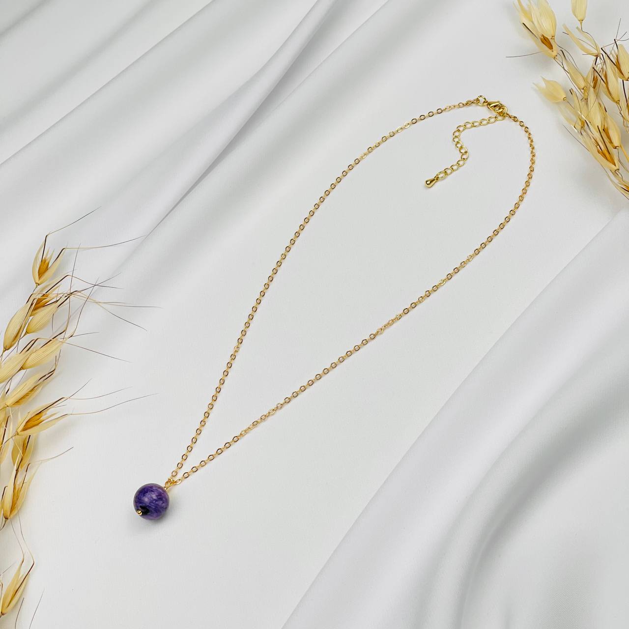 Цвет камня: Фиолетовый Месторожде..показатьние: Россия Камень: Чароит Покрытие: Золото 14К Диаметр: 12 мм Поверхность: Гладкий Производитель: Радуга Самоцветов (Россия) Тип замка: Карабин с цепочкойние: Россия