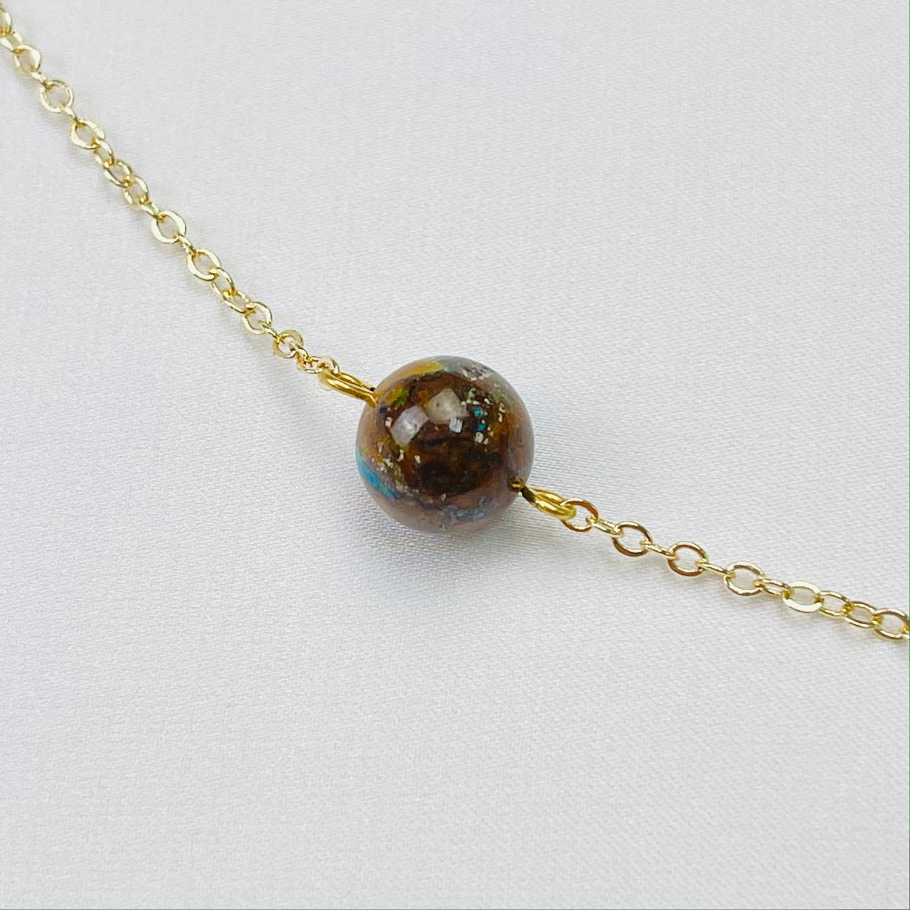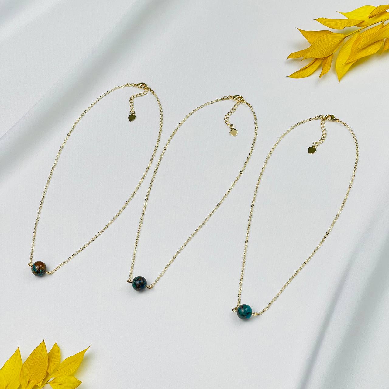 Цвет камня: Миксовый Месторождени..показатье: США Камень: Хризоколла Покрытие: Золото 14К Диаметр: 10 мм Поверхность: Гладкий Производитель: Радуга Самоцветов (Россия) Тип замка: Карабин с цепочкойе: США