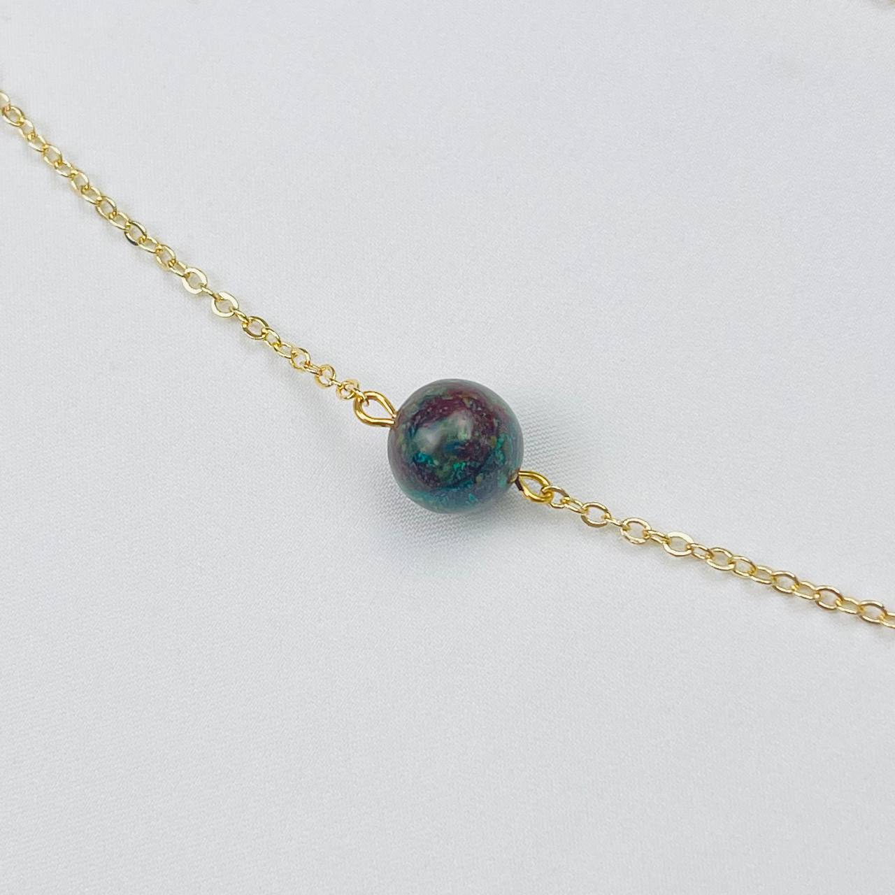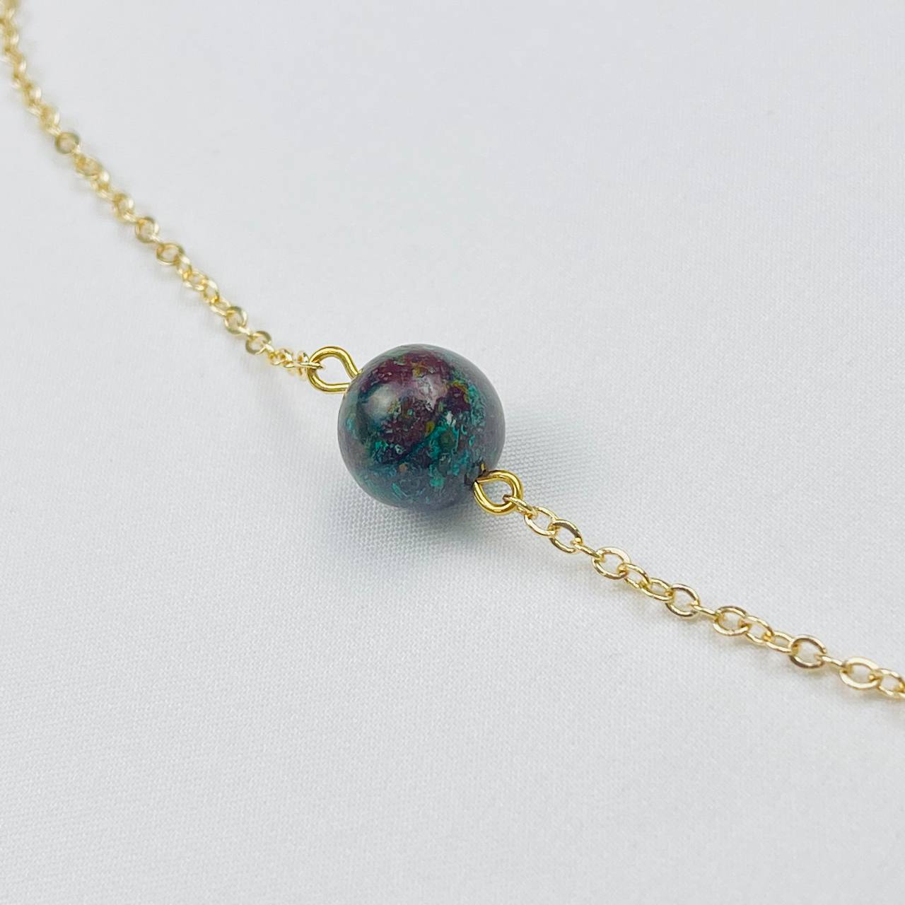 Цвет камня: Миксовый Месторождени..показатье: США Камень: Хризоколла Покрытие: Золото 14К Диаметр: 10 мм Поверхность: Гладкий Производитель: Радуга Самоцветов (Россия) Тип замка: Карабин с цепочкойе: США