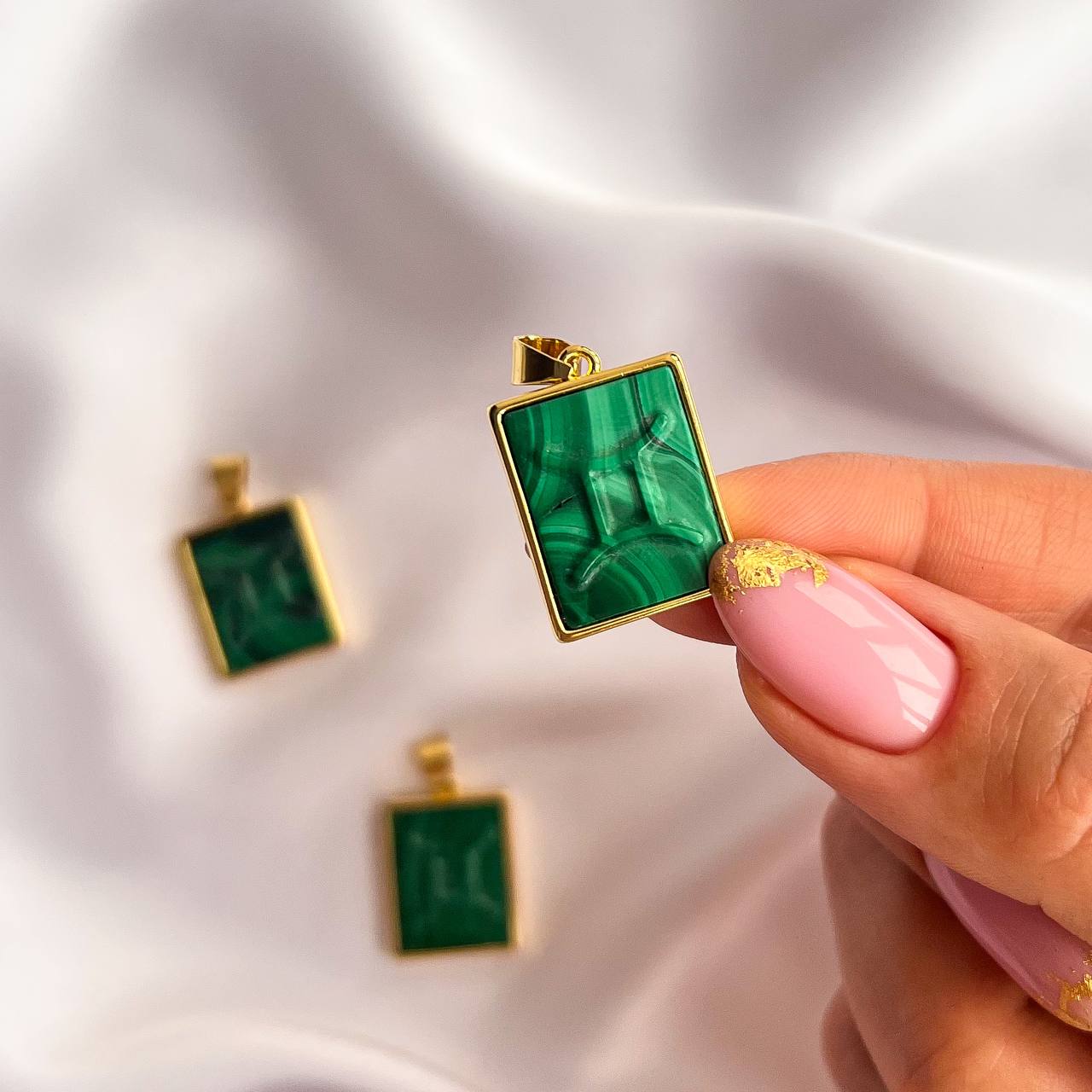 Цвет камня: Зелёный Месторождение..показать: Африка Камень: Малахит Покрытие: Золото 14К Поверхность: Гладкий Размер: 15х20 мм: Африка