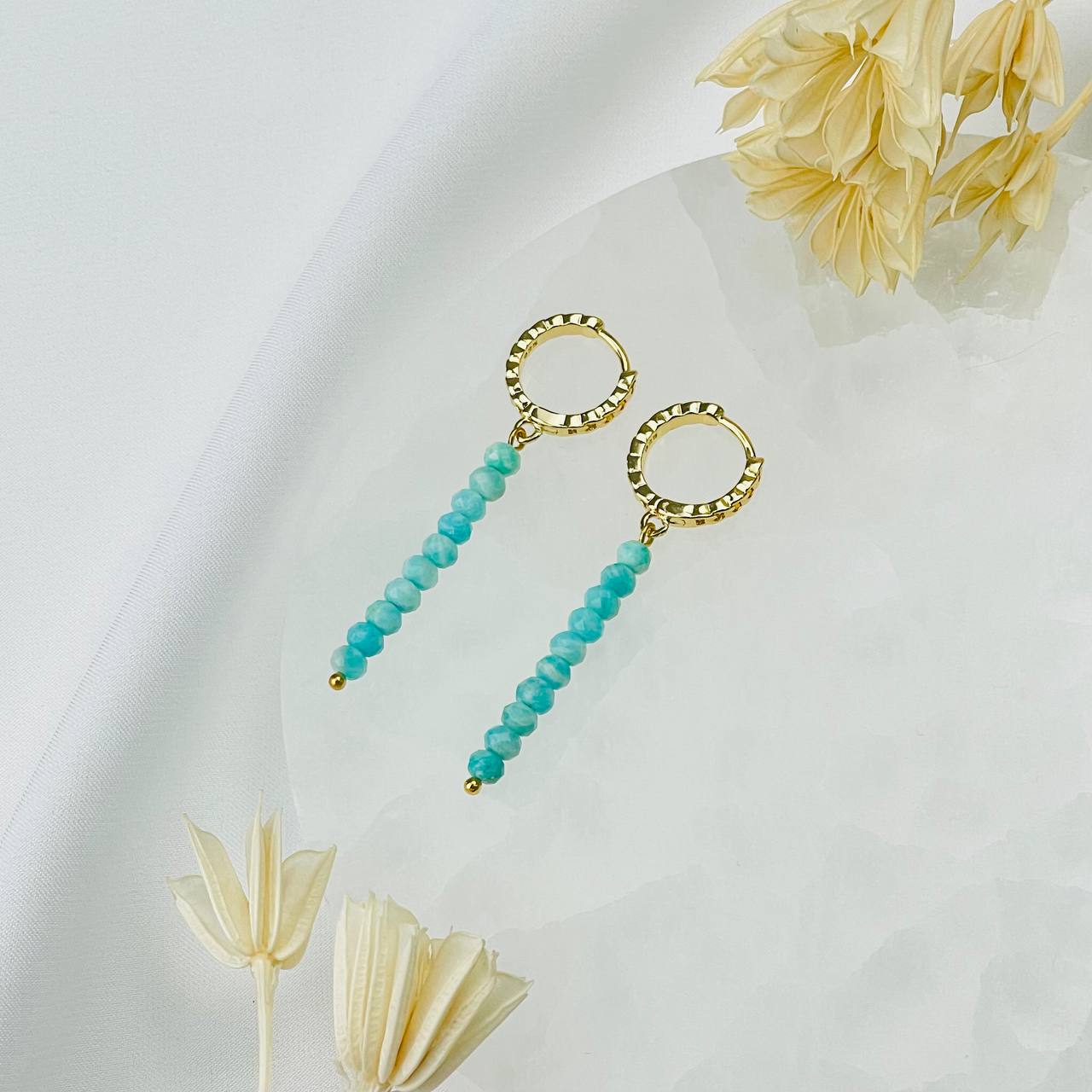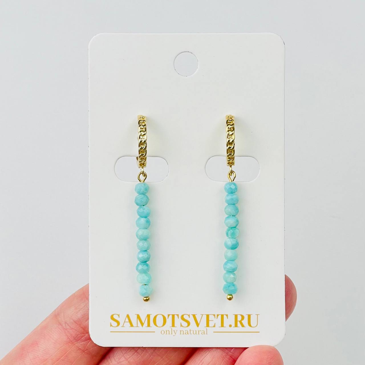 Цвет камня: Бирюзовый Месторожден..показатьие: Перу Камень: Амазонит Покрытие: Золото 18К Длина сережки: 45 мм Поверхность: Граненый Размер: 2,5х3,5 мм Производитель: Радуга Самоцветов (Россия) Тип швензы: Кольцевой замокие: Перу