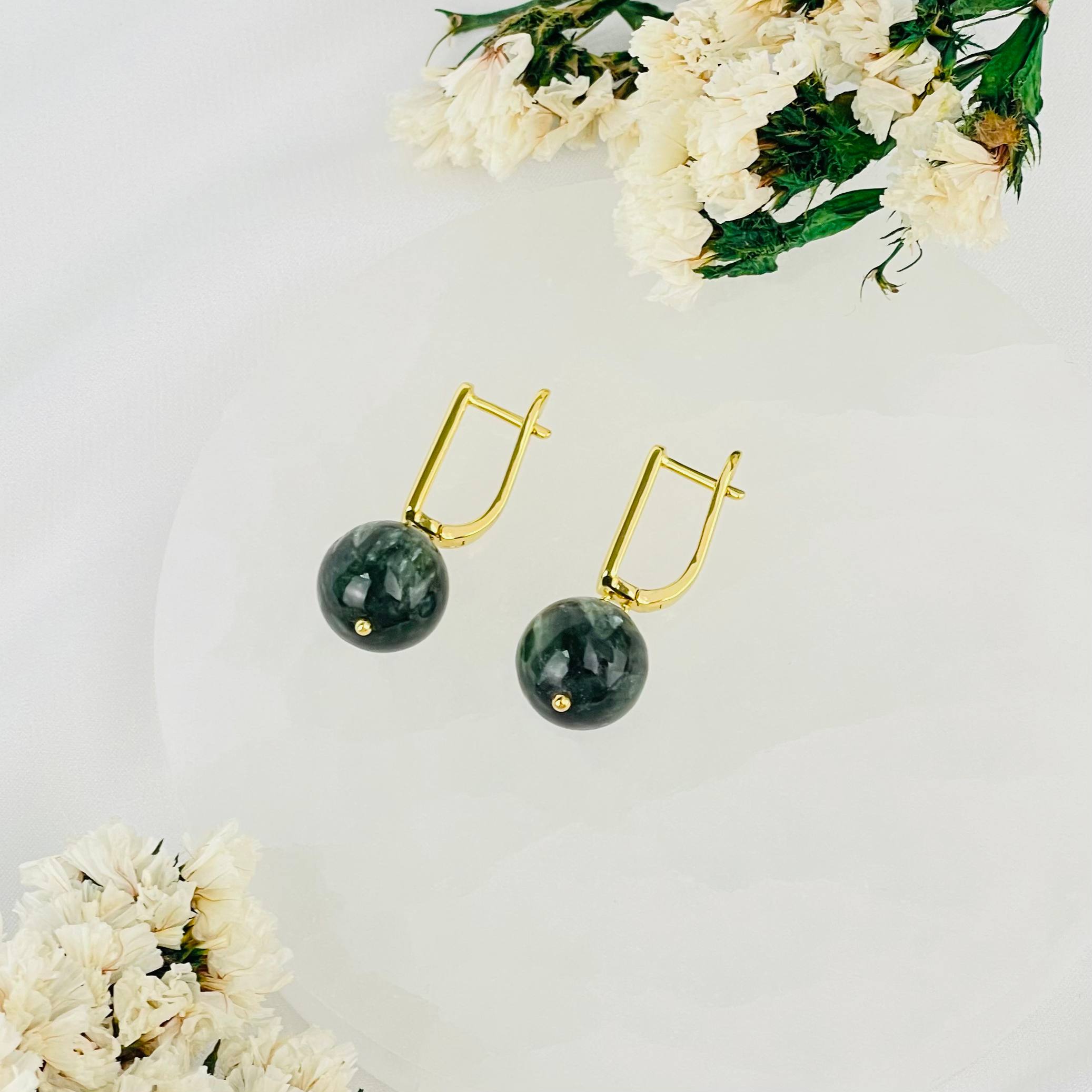 Цвет камня: Зелёный Месторождение..показать: Россия Камень: Серафинит Покрытие: Золото 18К Диаметр: 12,5 мм Поверхность: Гладкий Производитель: Радуга Самоцветов (Россия) Тип швензы: Английский замок: Россия