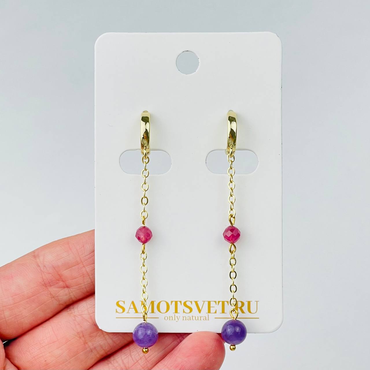 Радуга Самоцветов Серьги на цепочке из Аметиста и розового Турмалина