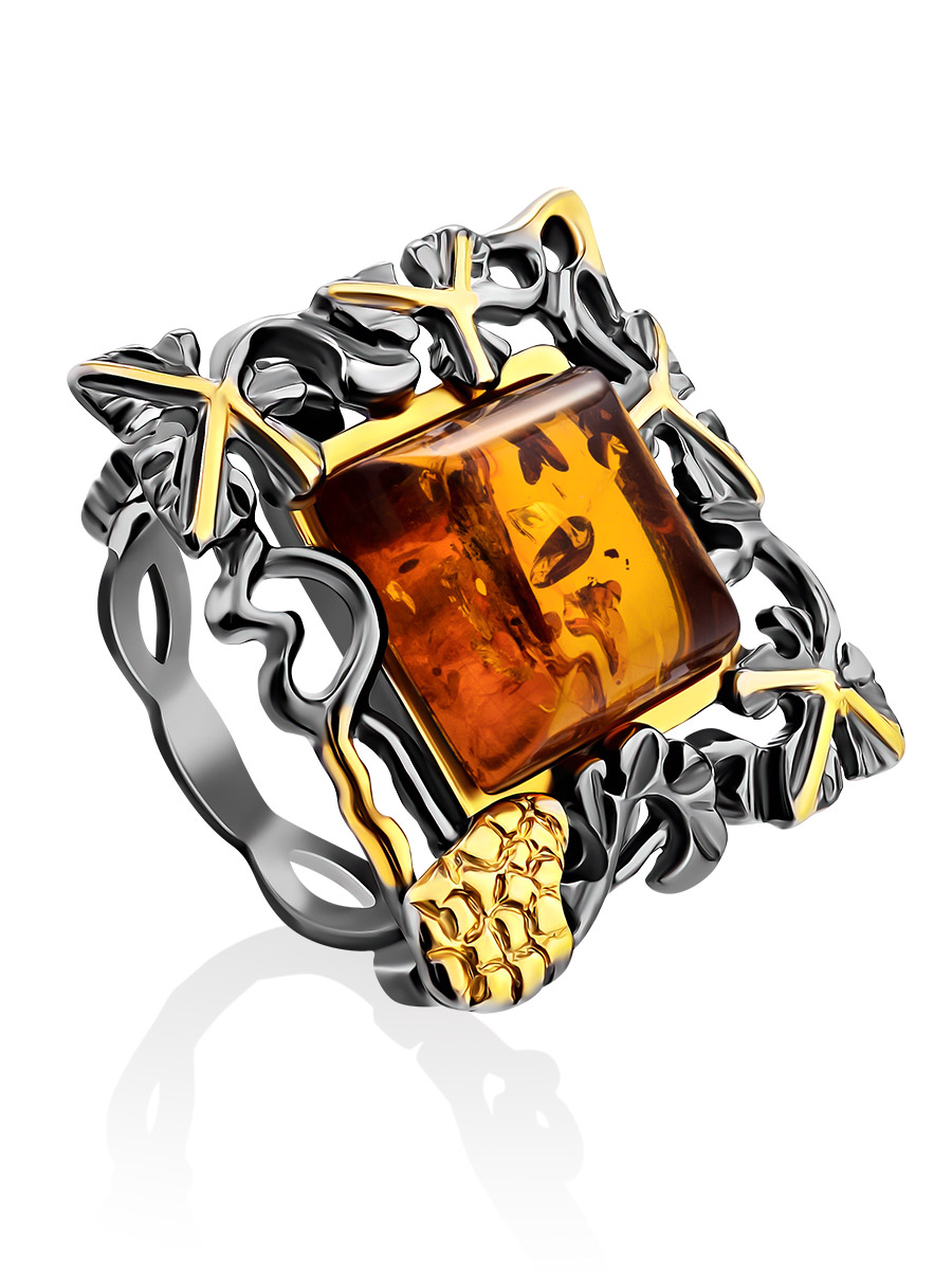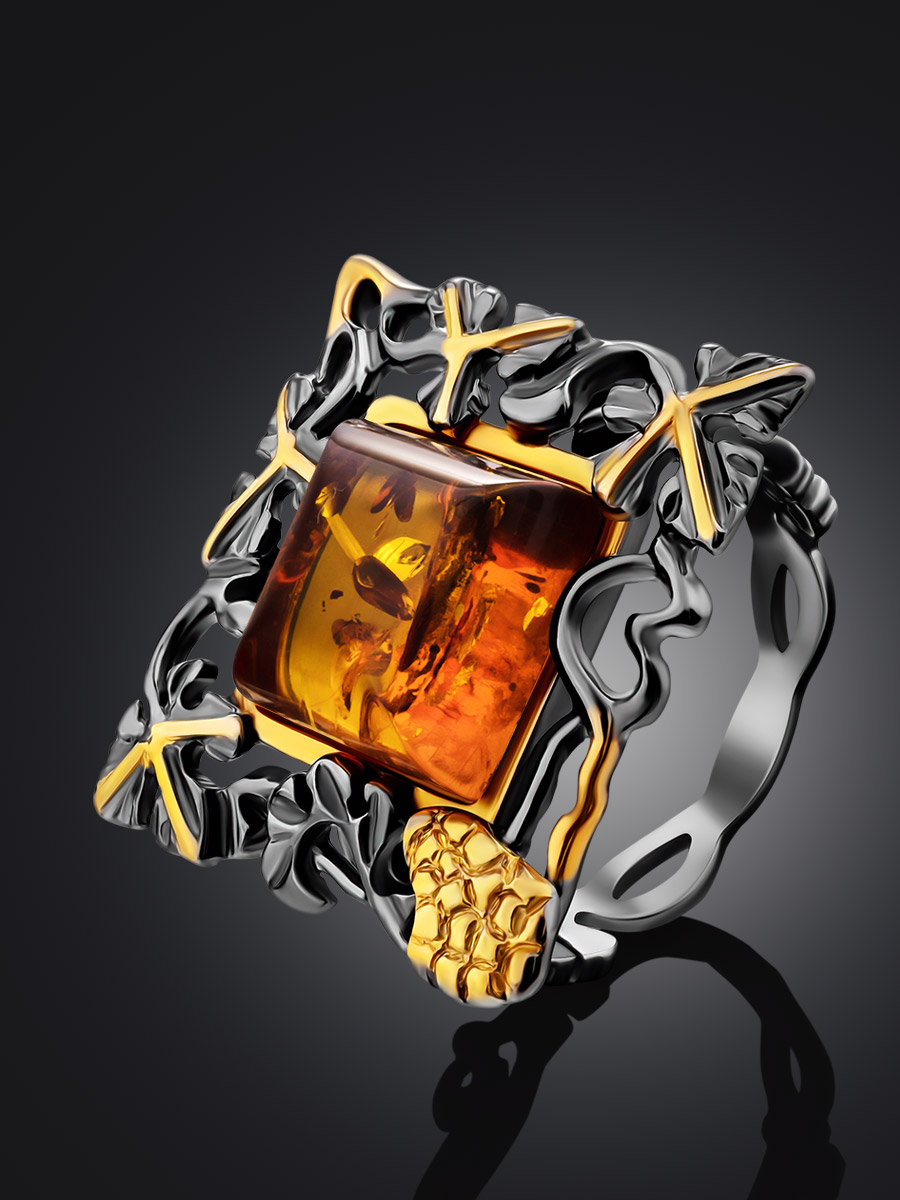 Роскошное ажурное кольцо из серебра с чернением и золочением и янтаря «Лиора»