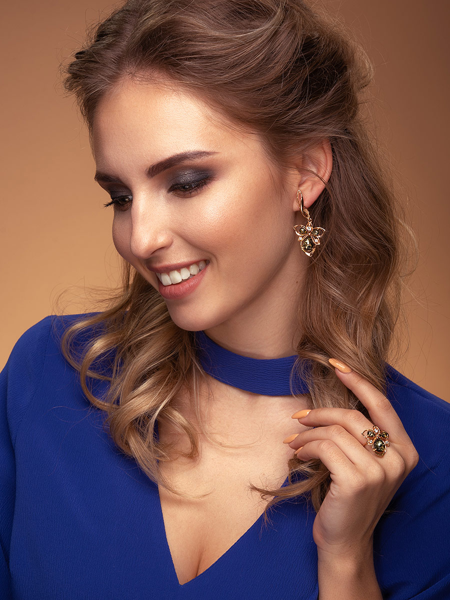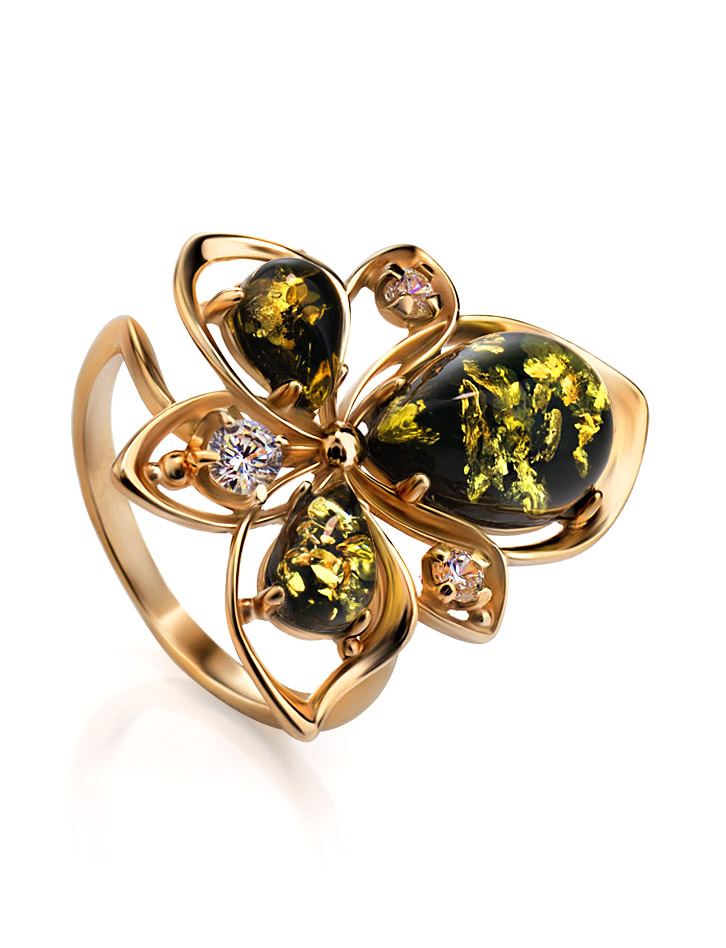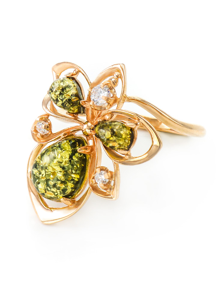 Роскошное кольцо «Эдельвейс» из зелёного янтаря
