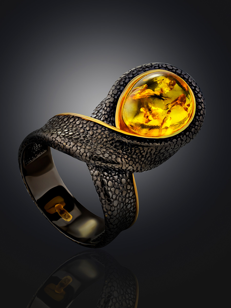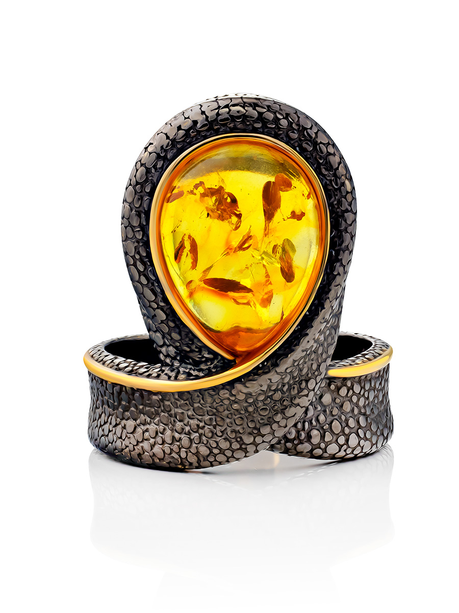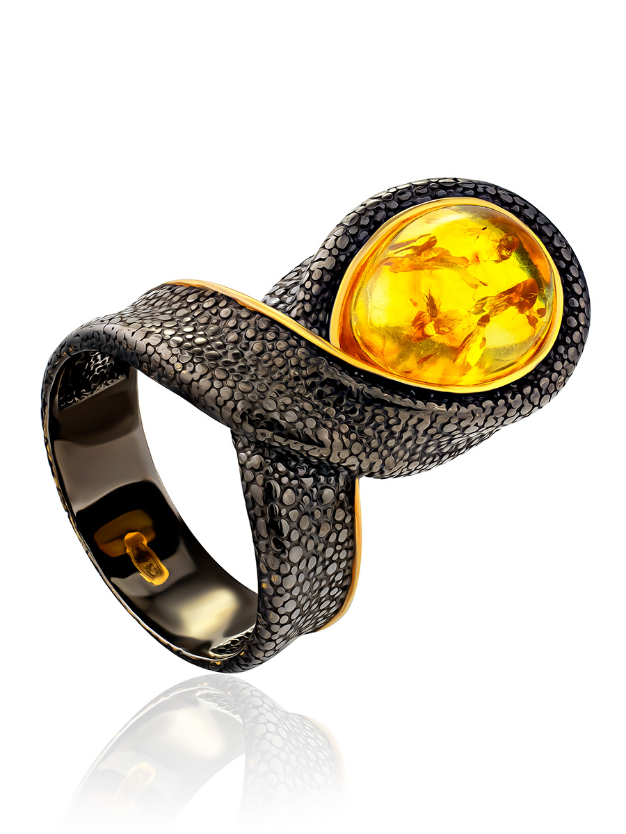 Роскошное кольцо из серебра с необычной текстурой и натурального янтаря «Змейка»