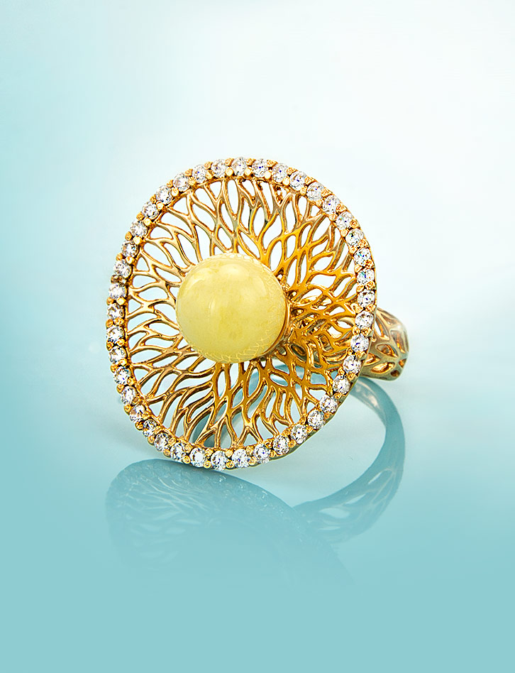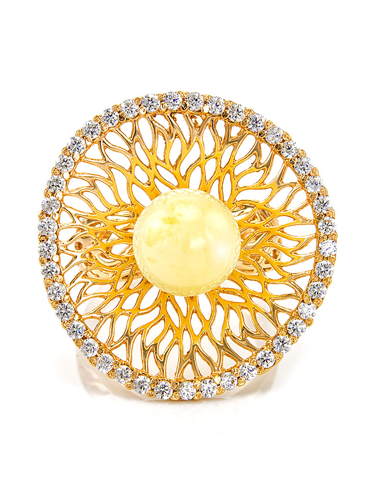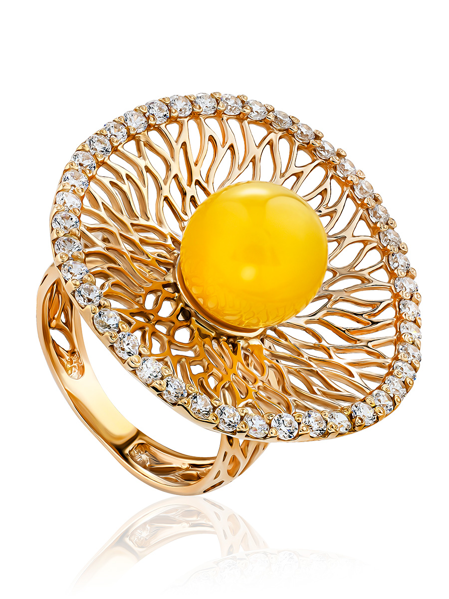 Роскошное кольцо с цирконитами и медовым янтарём «Венера»