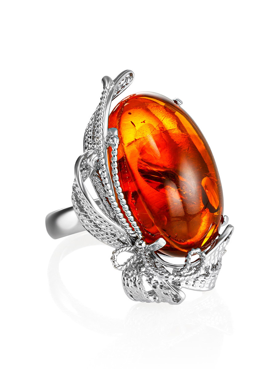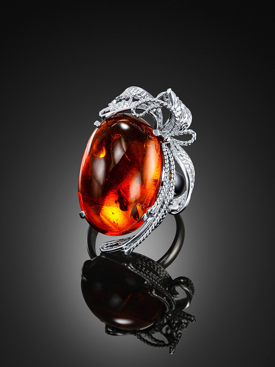 Роскошное кольцо со вставкой из натурального янтаря коньячного цвета «Филигрань»