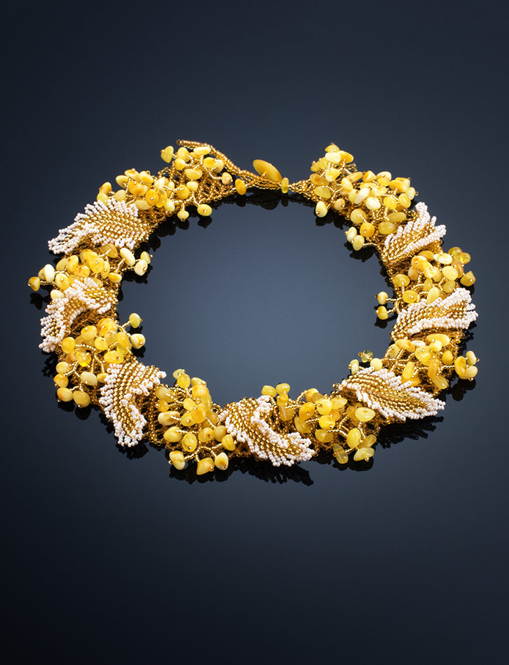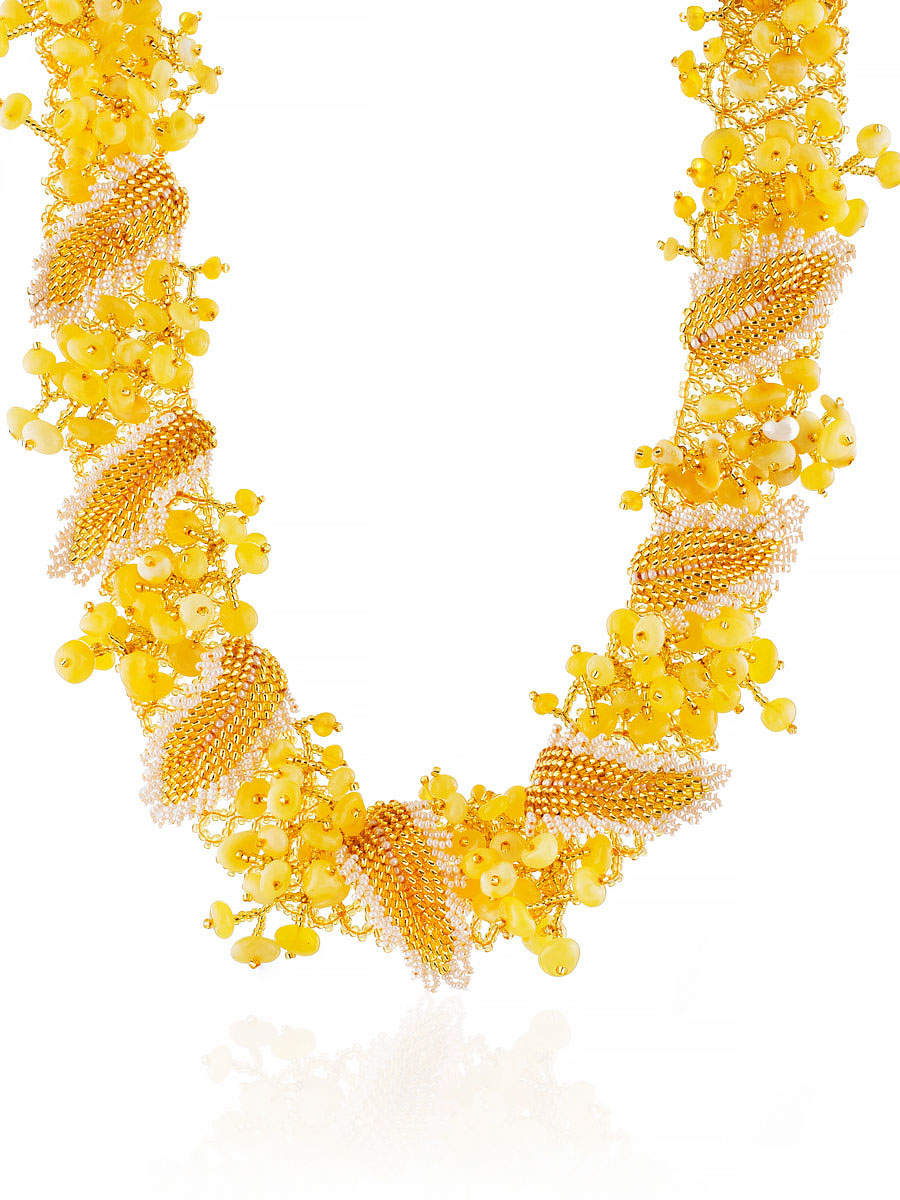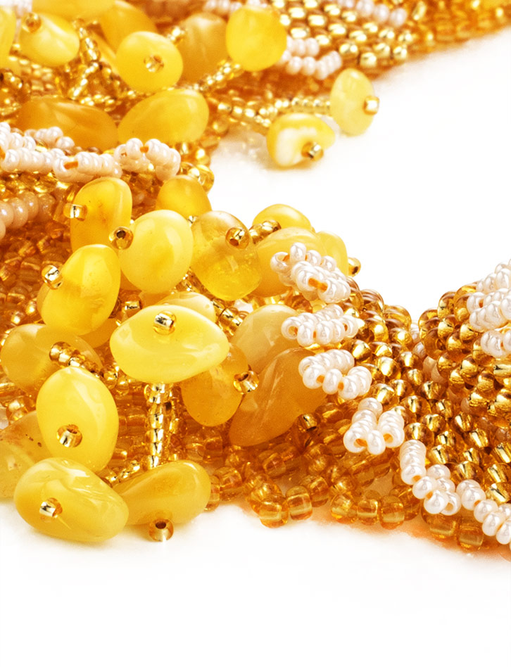 Роскошное колье «Лукоморье» из бисера и натурального янтаря