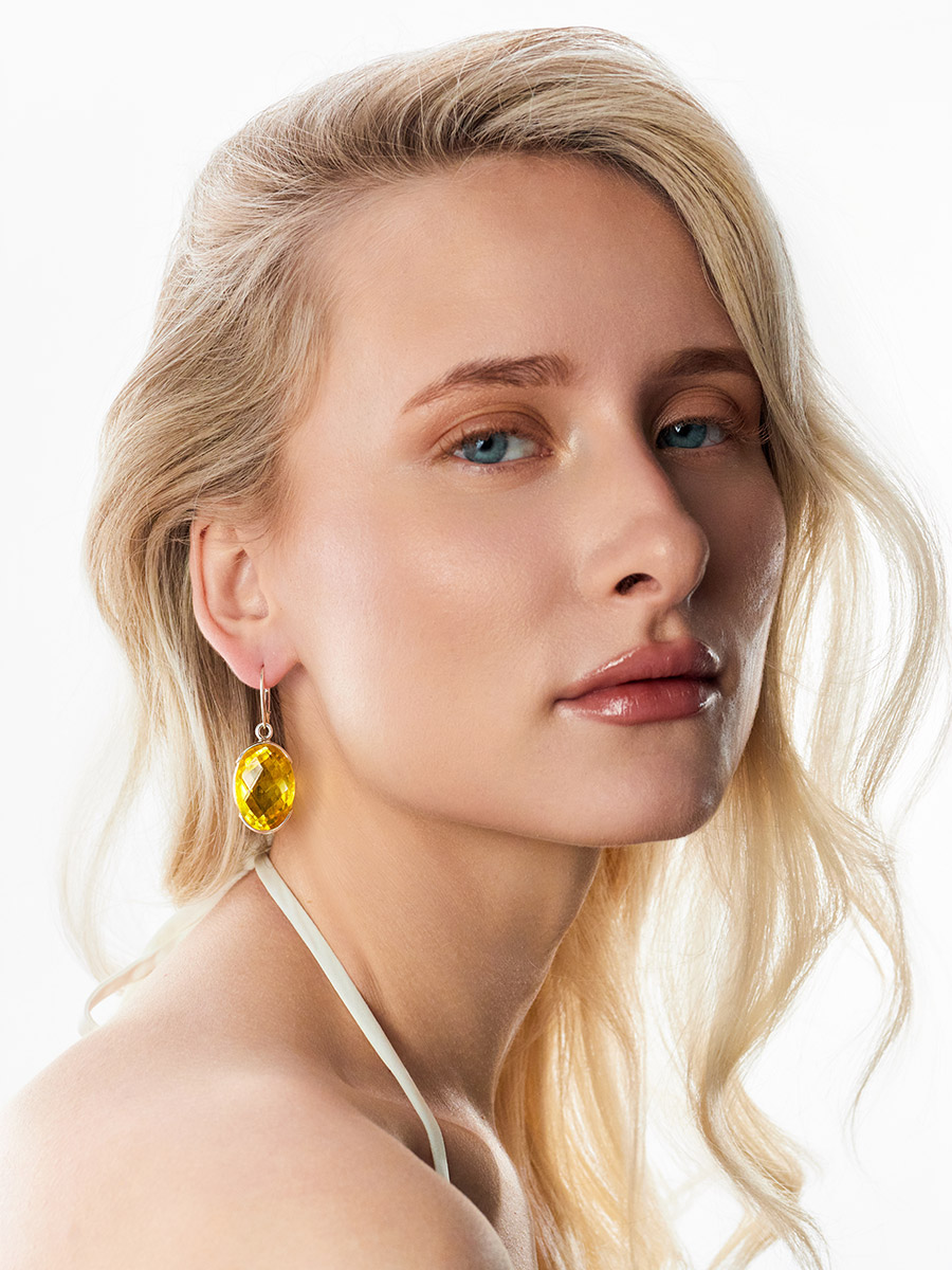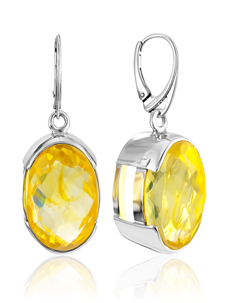 Роскошные объёмные серьги с крупной янтарной вставкой с алмазной огранкой