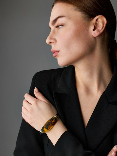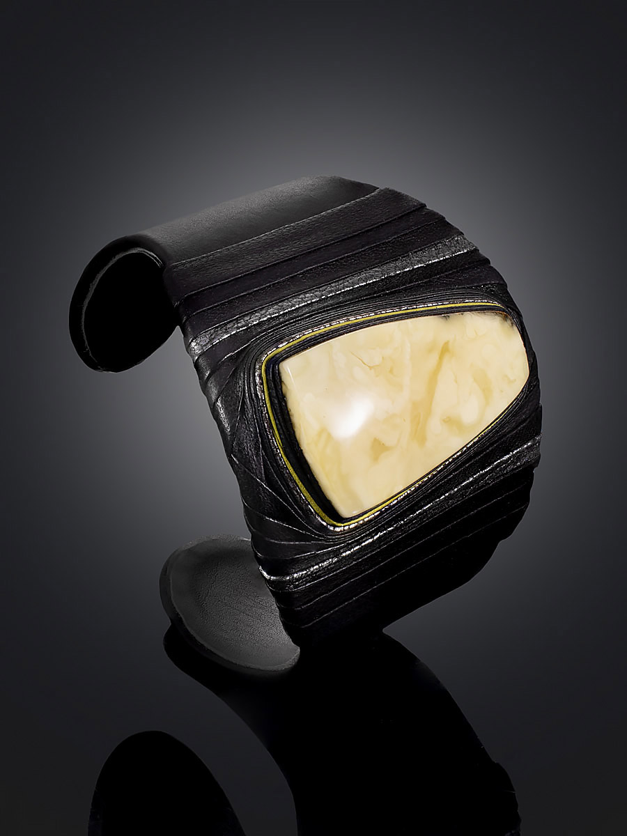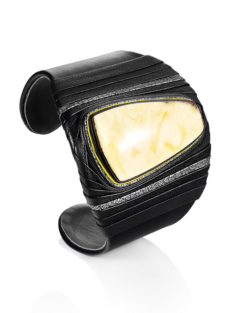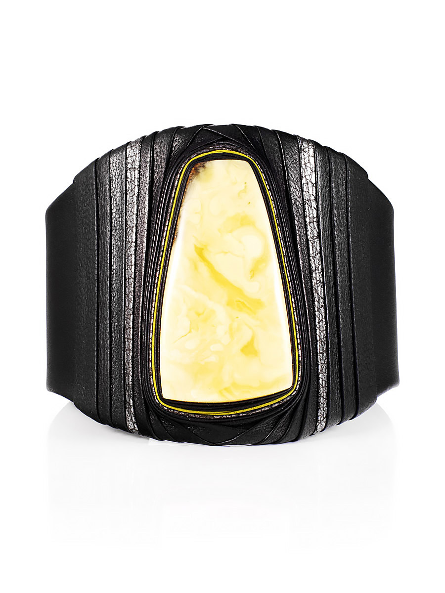 Роскошный браслет «Нефертити» из чёрной кожи и натурального янтаря