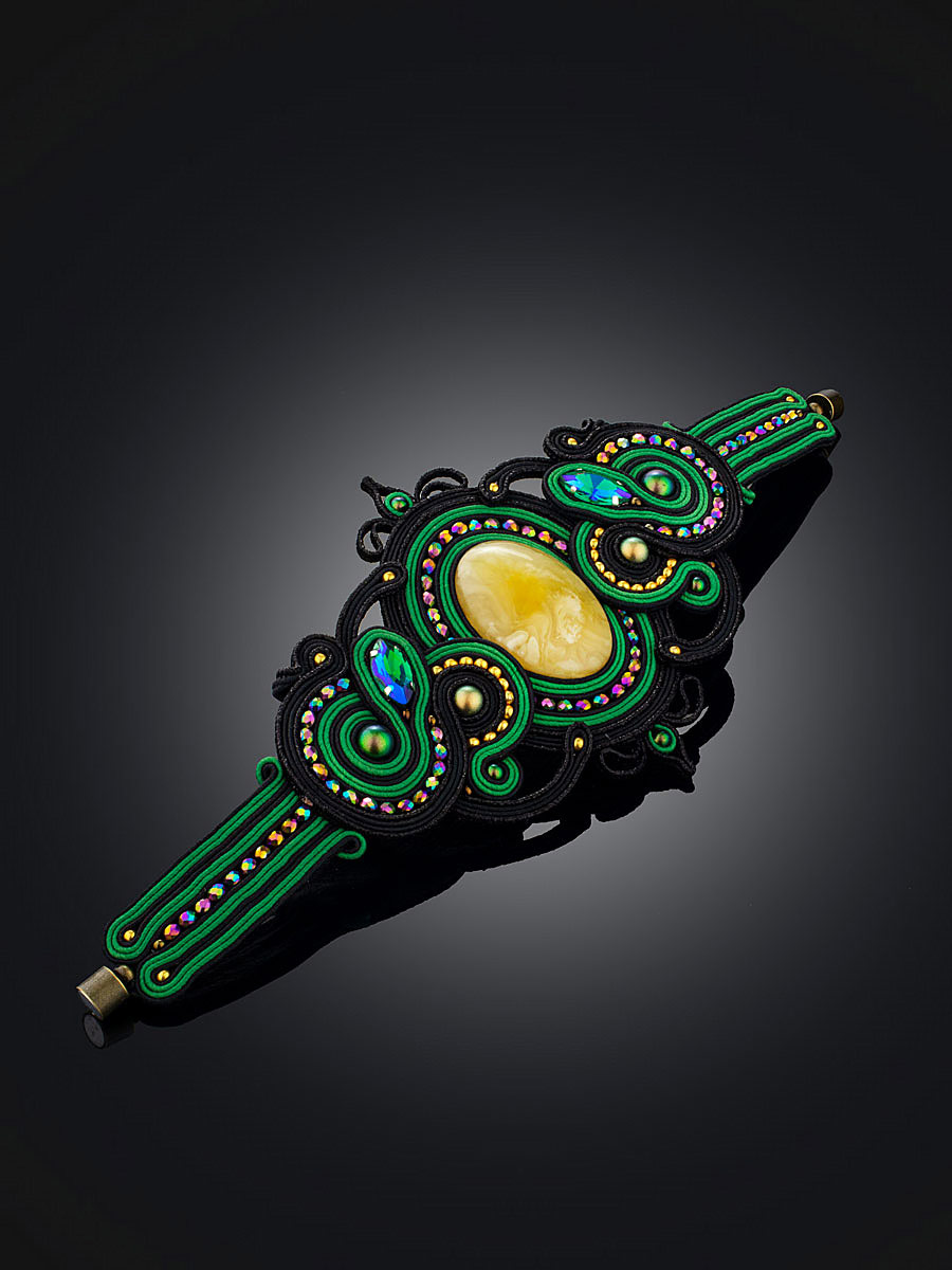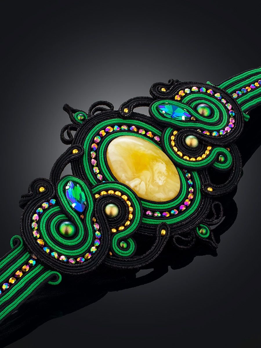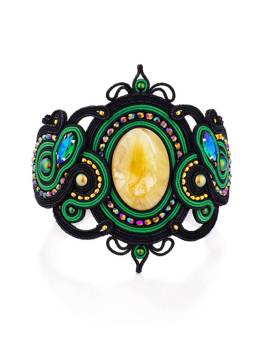 Роскошный плетёный браслет «Индия» с натуральным цельным янтарём, украшенный кристаллами и бисером