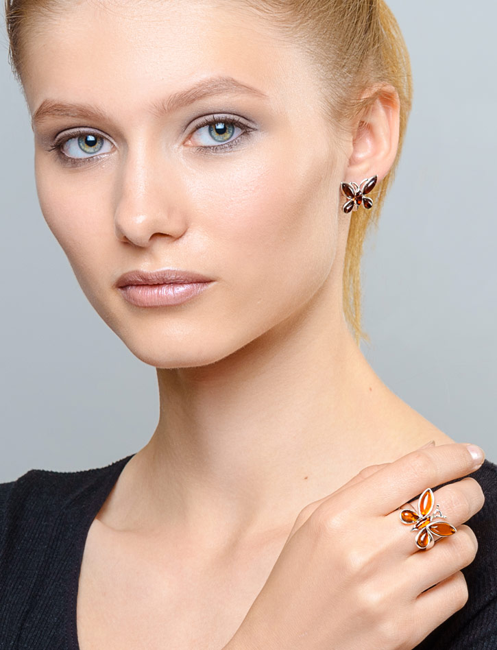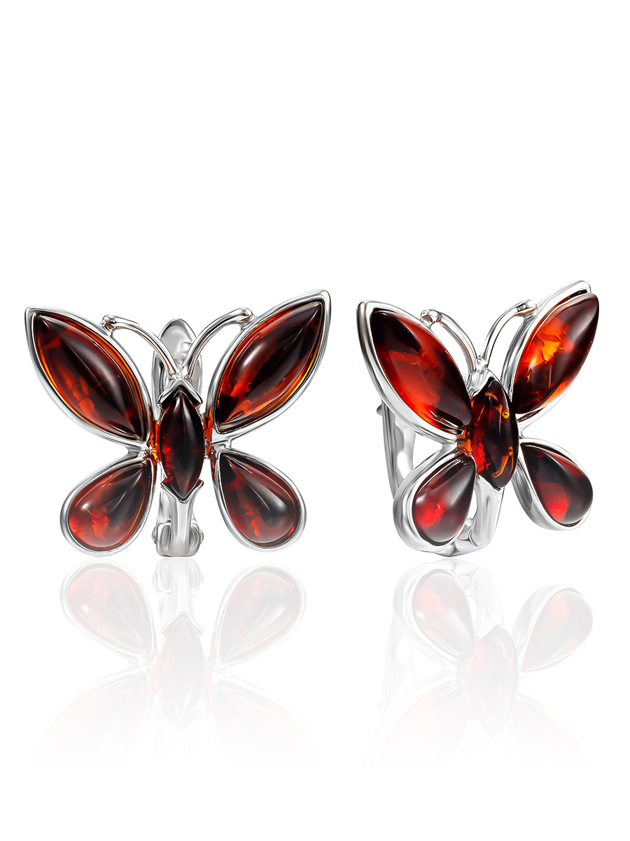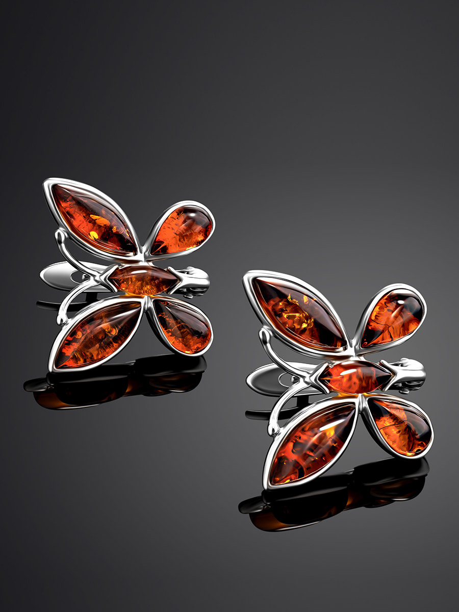 Серьги-бабочки, украшенные янтарём коньячного цвета «Апрель»
