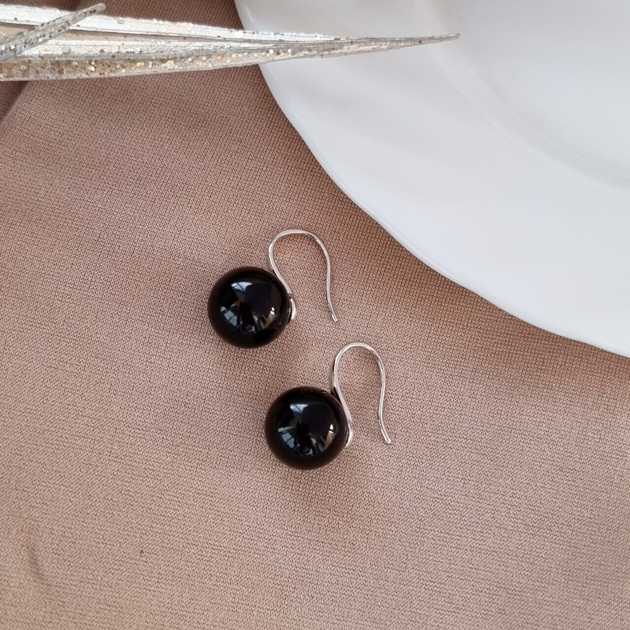 Серьги черные бусины, посеребрение, арт.032.013