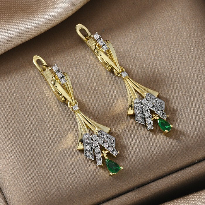 Серьги длинные подвески ювелирная бижутерия Итальянское золото (покрытие желтое 14к), вставка: фианит, цвет: зеленый и прозрачный, арт.217.188