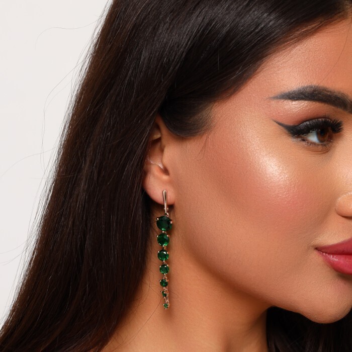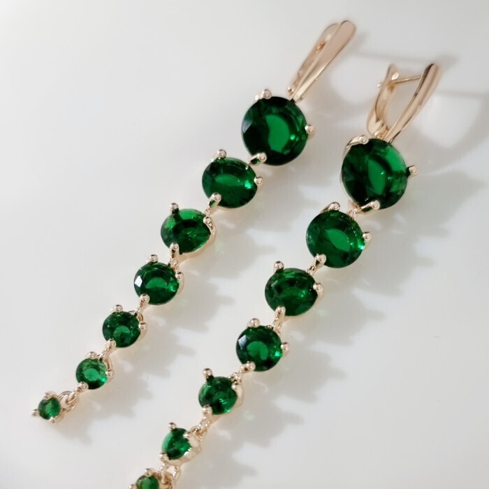 Серьги длинные подвески ювелирная бижутерия коллекция "Дубай", покрытие: позолота 18К, вставка: фианиты, цвет: зеленый, арт.215.130