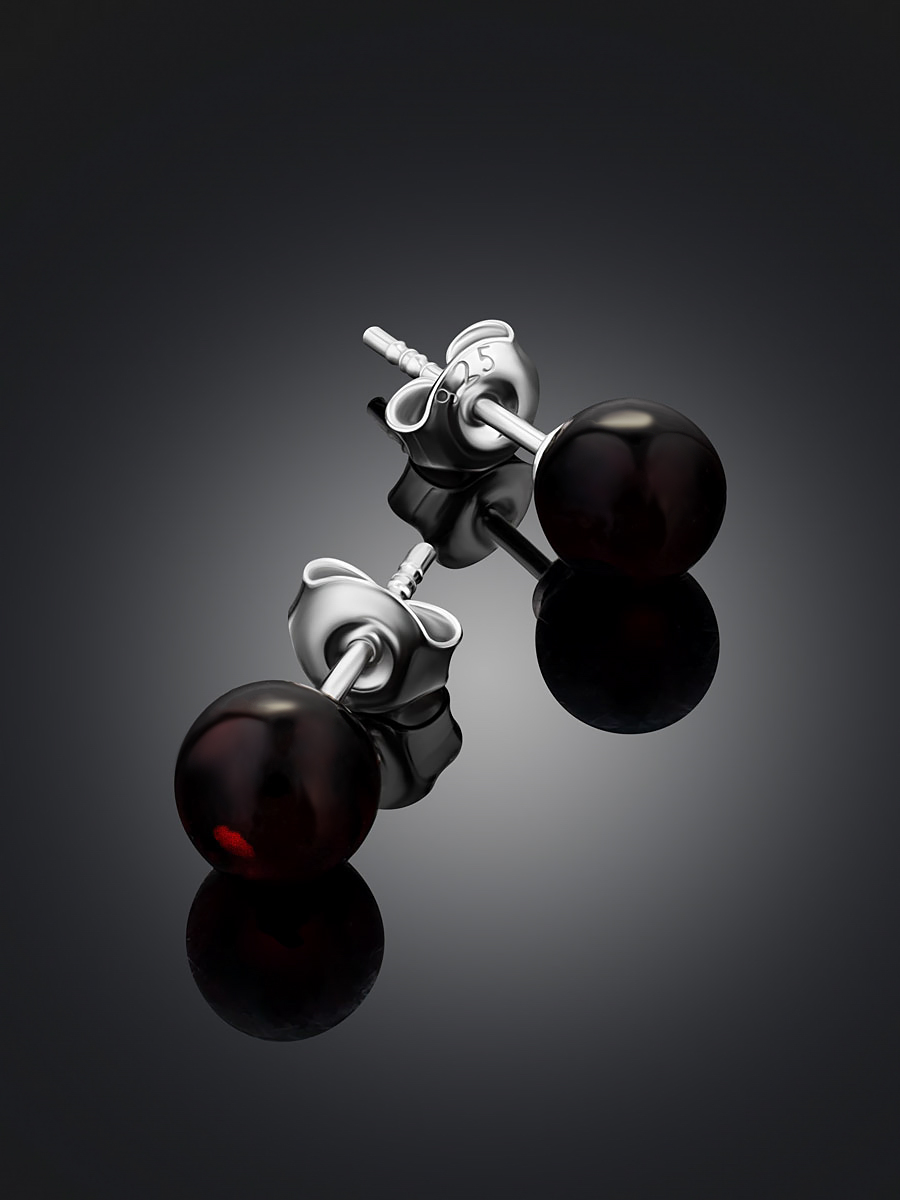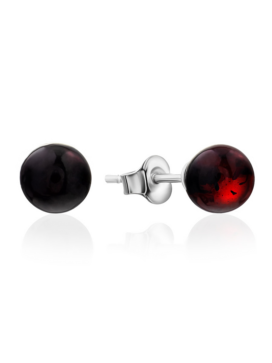 Серьги-гвоздики с натуральным вишнёвым янтарем в форме шарика