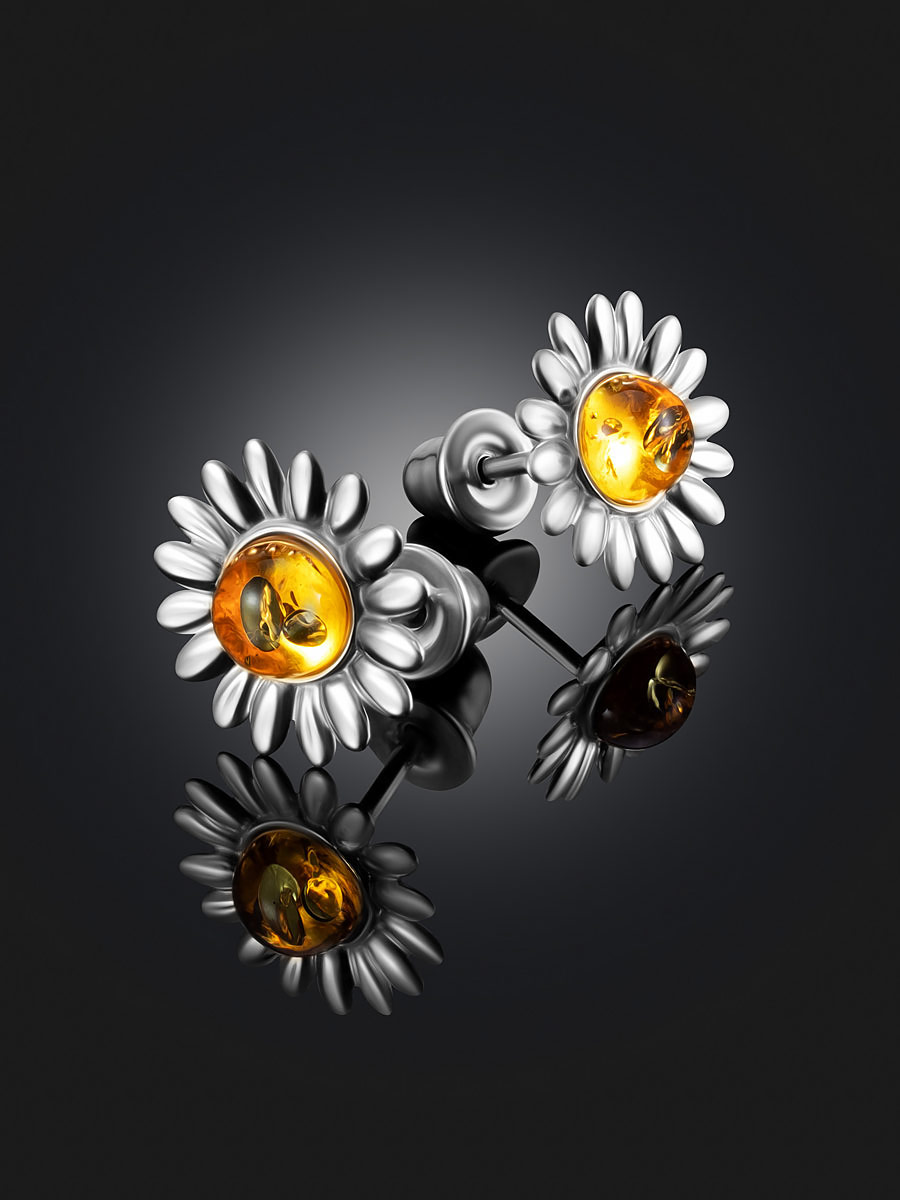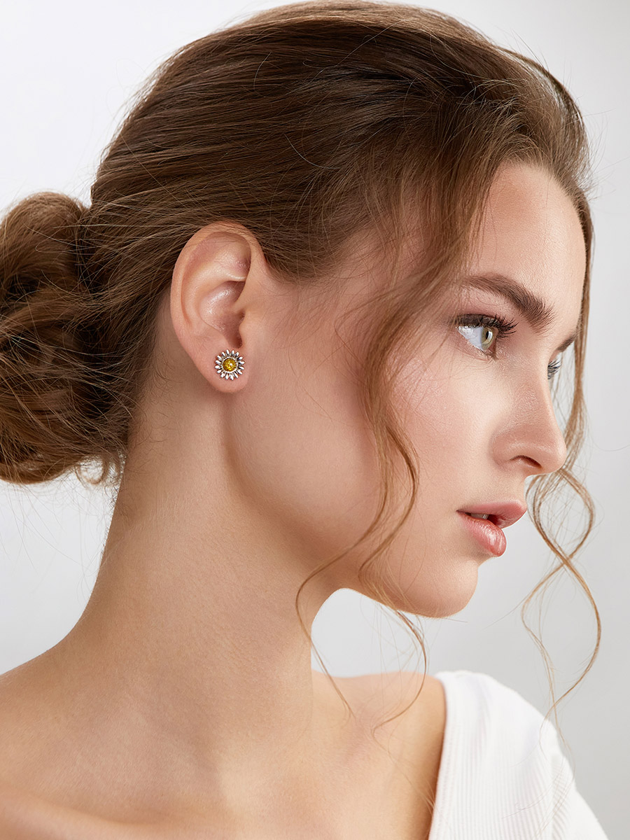 Серьги-гвоздики с янтарём лимонного цвета «Ромашка»