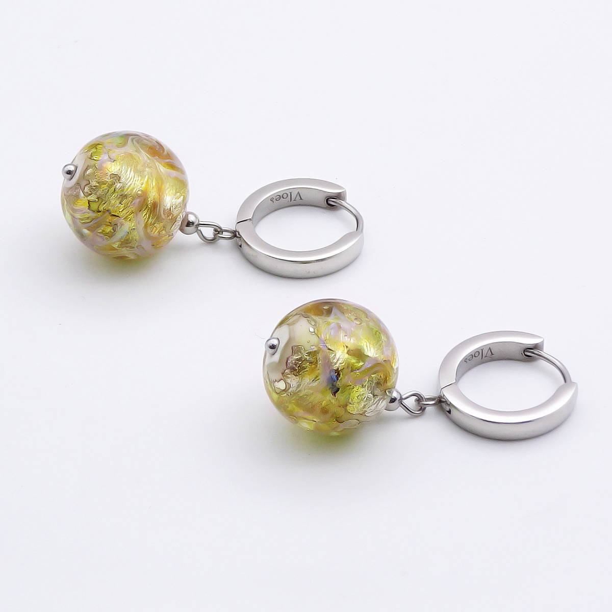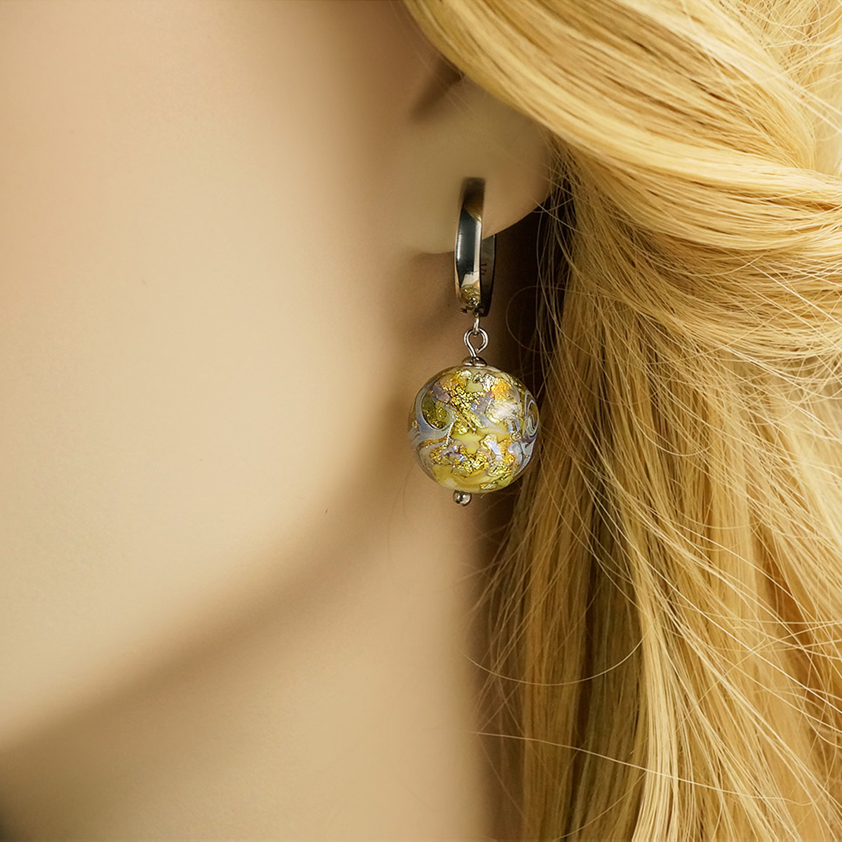 Серьги изготовлены из муранского стекла и гипоаллергенной ювелирной стали, что очень важно для людей с чувствительной кожей. Металл не темнеет и не подвергается воздействиям окружающей среды, надолго обеспечивая красивый внешний вид изделия. Длина серег - 4 см. Диаметр стеклянного шарика - 1,5 см.  Вес обеих серег - 14 гр.
