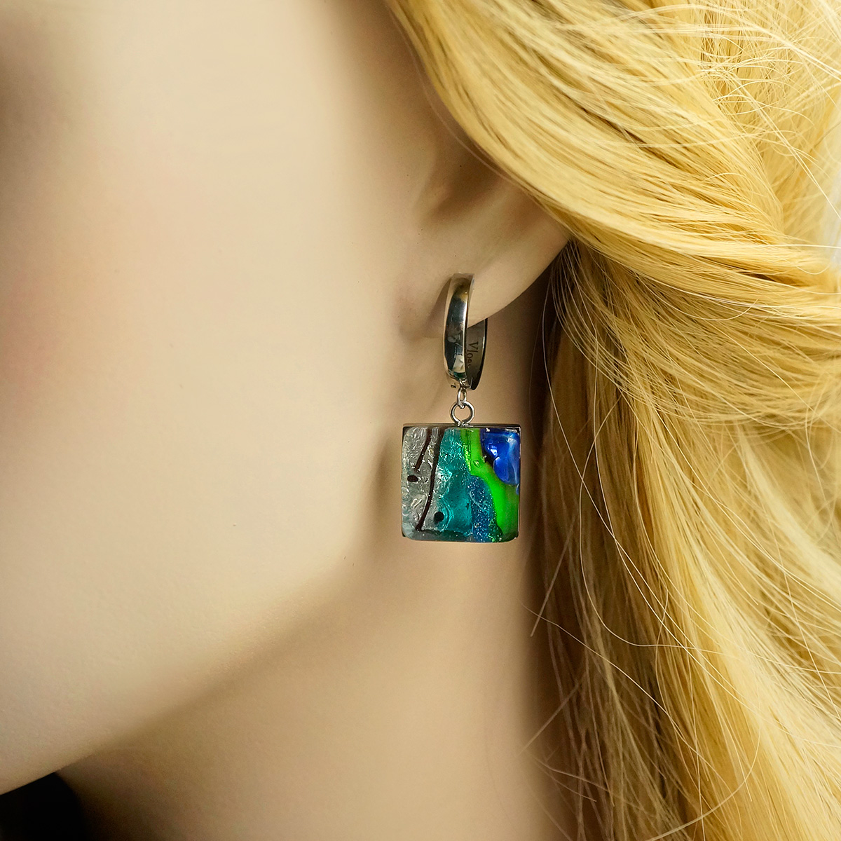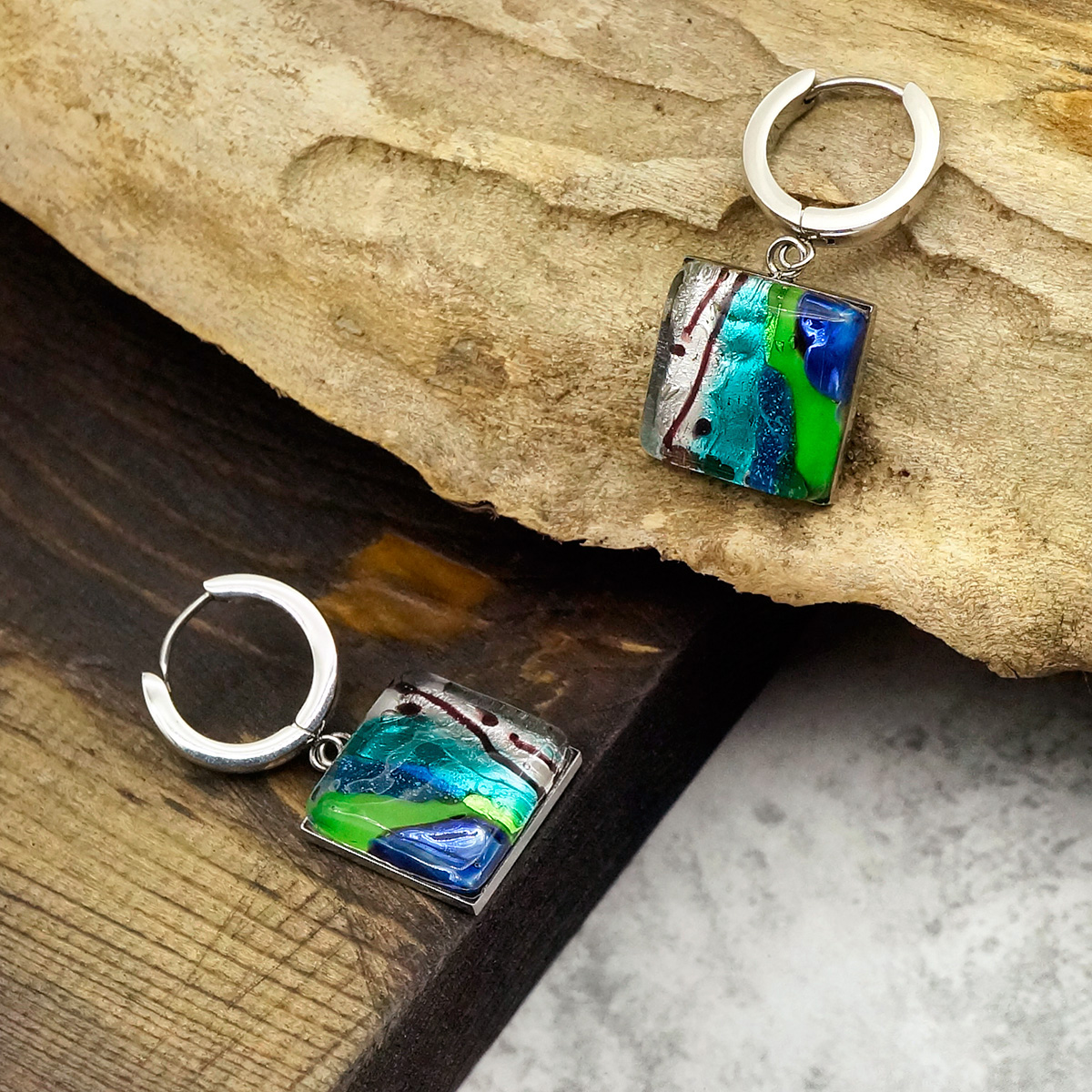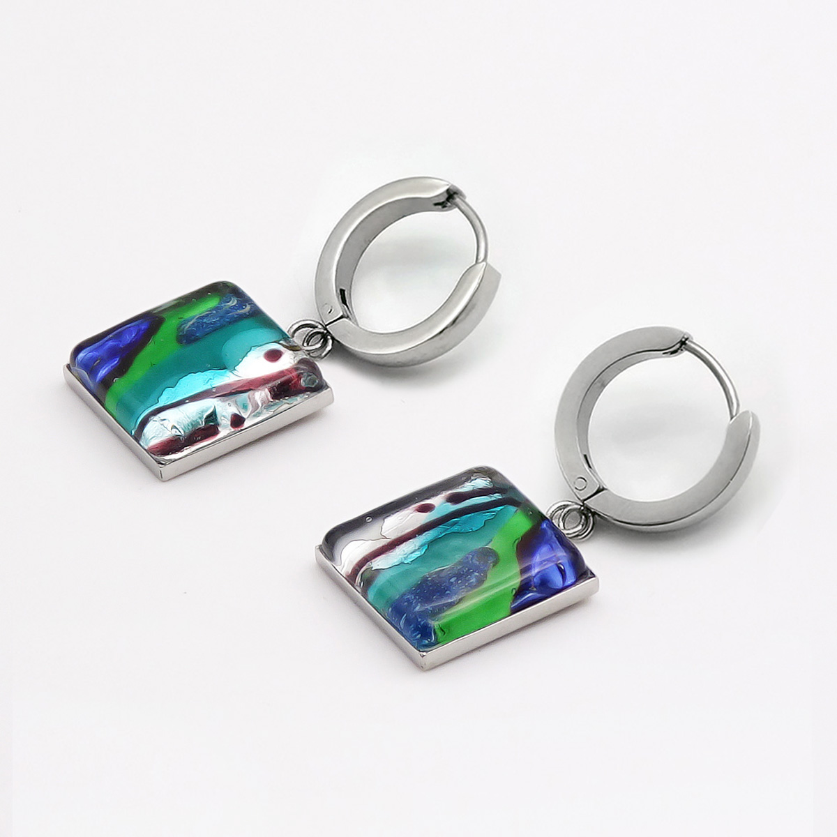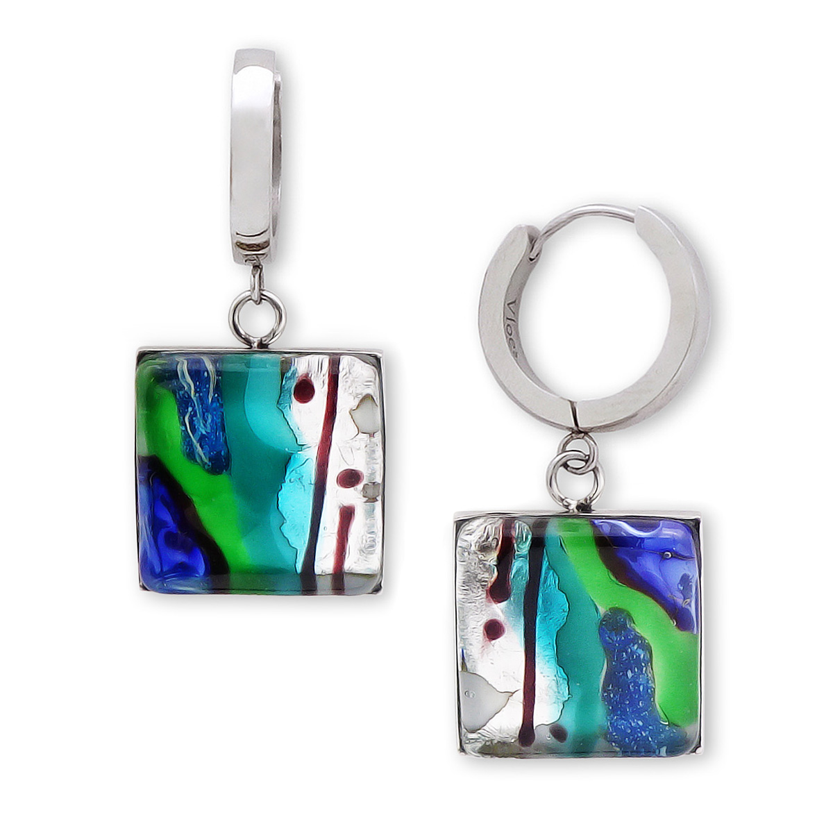 Серьги изготовлены из муранского стекла и гипоаллергенной ювелирной стали, что очень важно для людей с чувствительной кожей. Металл не темнеет и не подвергается воздействиям окружающей среды, надолго обеспечивая красивый внешний вид изделия. Длина серег - 3,5 см. Размер  стеклянного элемента 1,6х1,6 см. Вес обеих серег - 9 гр.