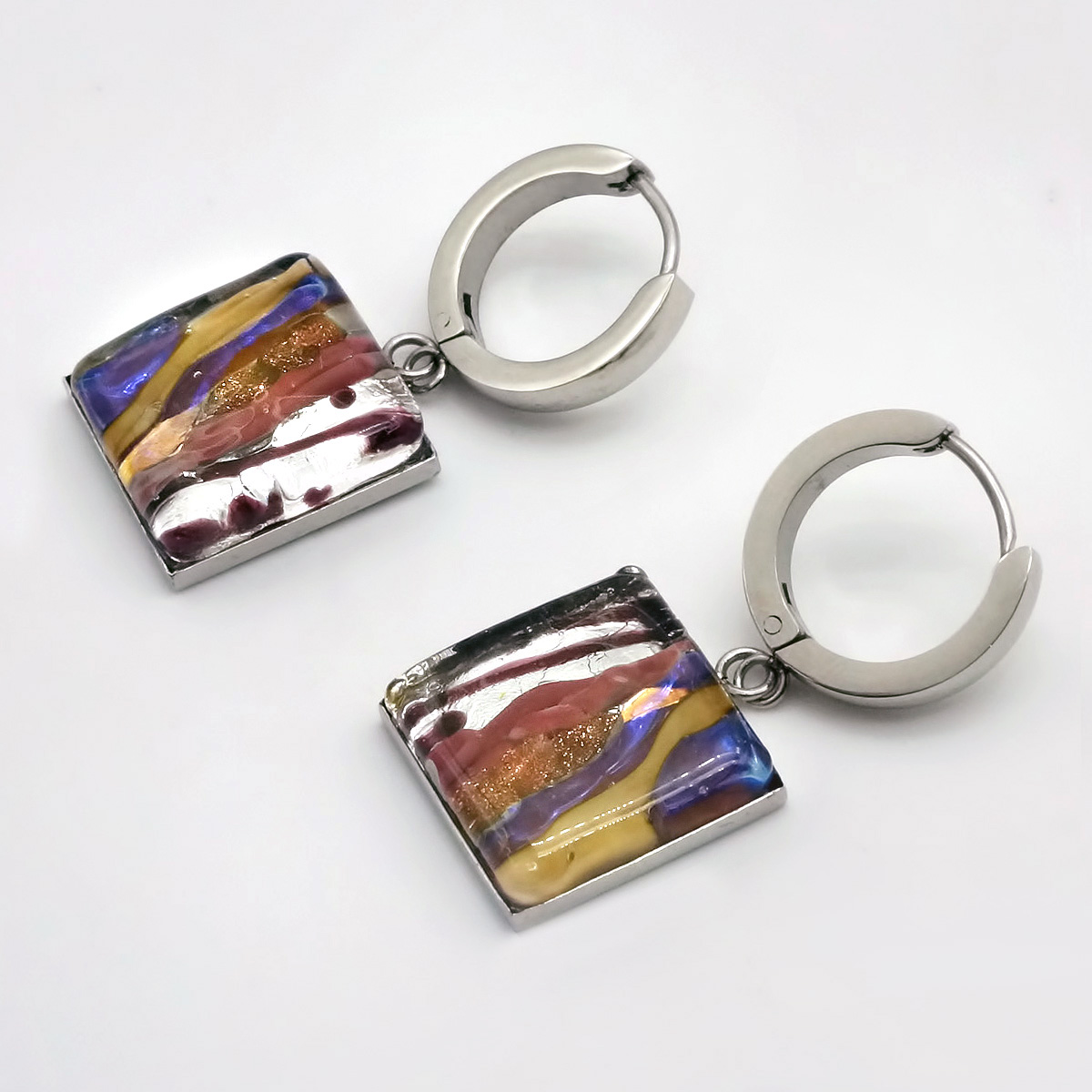 Серьги изготовлены из муранского стекла и гипоаллергенной ювелирной стали, что очень важно для людей с чувствительной кожей. Металл не темнеет и не подвергается воздействиям окружающей среды, надолго обеспечивая красивый внешний вид изделия. Длина серег - 3,5 см. Размер  стеклянного элемента 1,6х1,6 см. Вес - 9 гр.