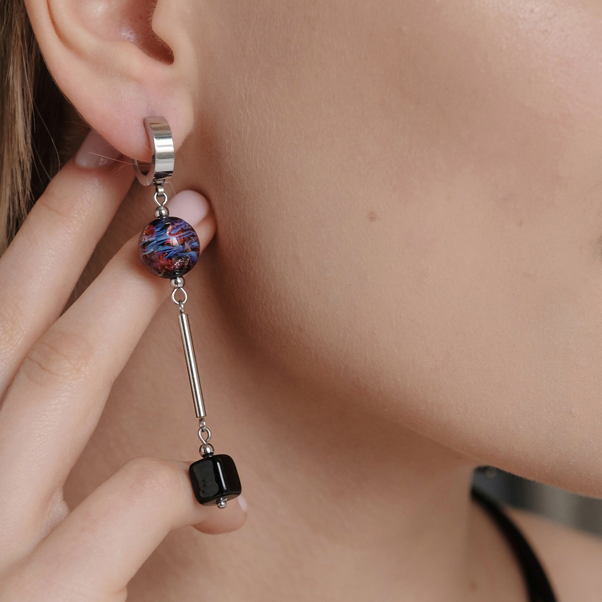 Серьги изготовлены из муранского стекла и гипоаллергенной ювелирной стали, что очень важно для людей с чувствительной кожей. Металл не темнеет и не подвергается воздействиям окружающей среды, надолго обеспечивая красивый внешний вид изделия. Длина серег - 7,5 см. Диаметр стеклянного шарика - 1,2 см. Кубик - 1х1 см.  Вес обеих серег - 11 гр.